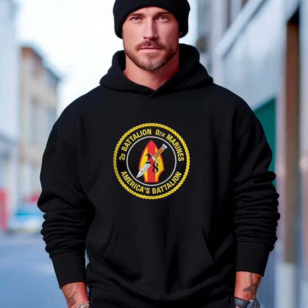 .The 2d Battalion 8th Marines Americas Battalion Logo Shirt is more than just apparel; it’s a powerful symbol of pride and camaraderie among those who have served or support the Marine Corps. Featuring the iconic logo that represents bravery, sacrifice, and unity, this shirt allows you to wear your allegiance with honor.