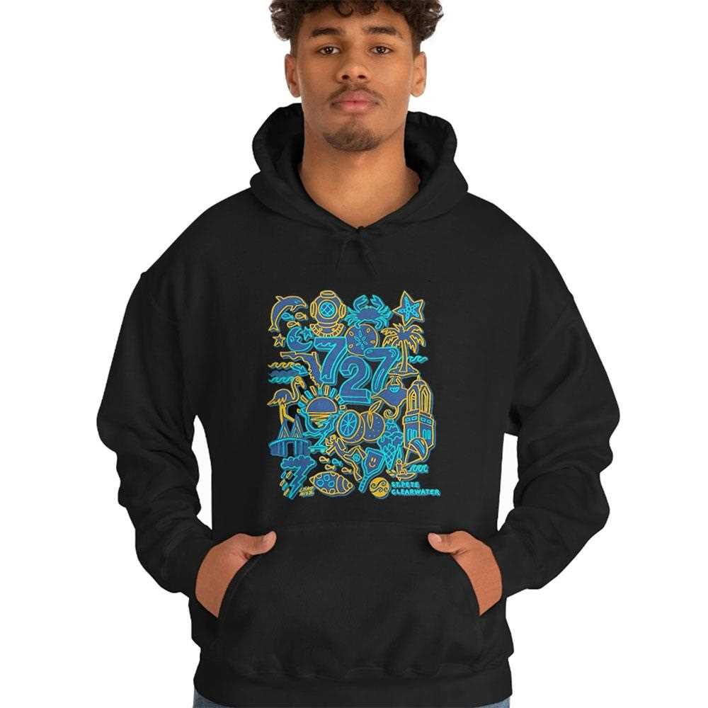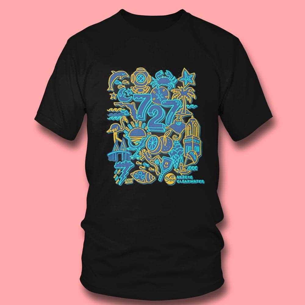 A vibrant and artistic tribute to the 727 area code. This beautiful t-shirt, designed by artist Chad Mize, is a colorful, abstract collage of everything that makes the St. Pete/Clearwater area special. It’s a piece of wearable local art. Represent the 727 in style! This is a must-have for any local or visitor who appreciates the unique art and culture of the area. Get yours and support local art!.