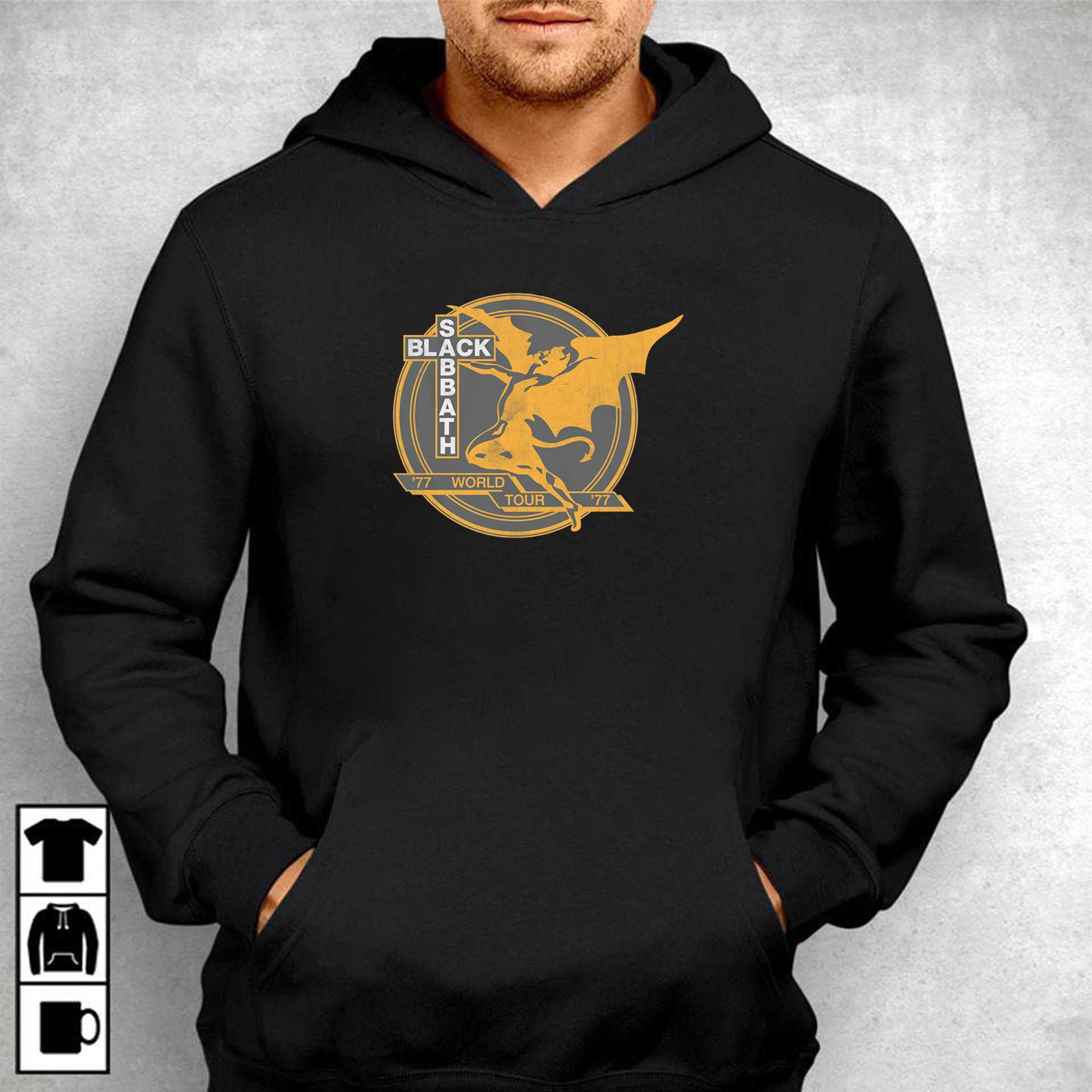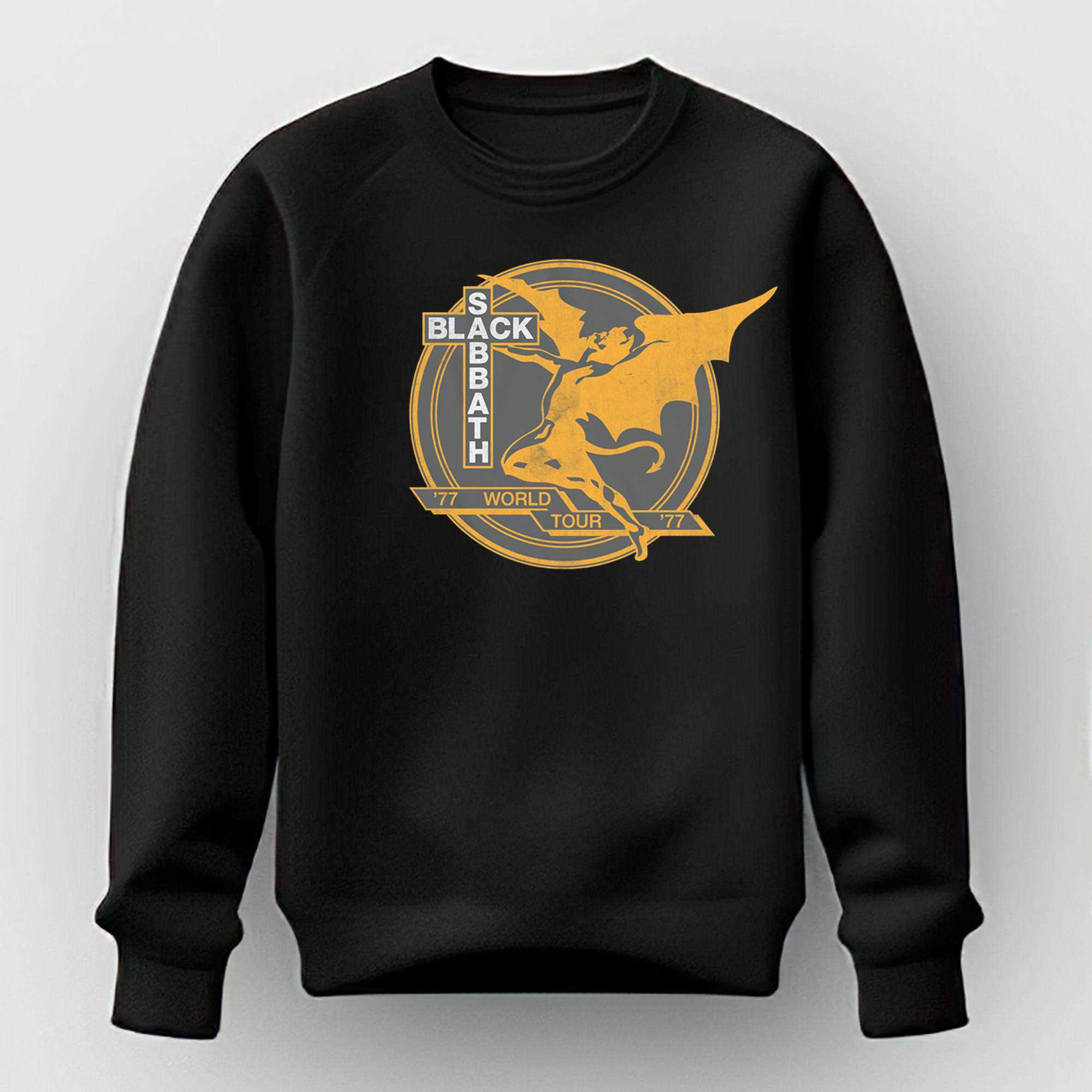 The golden-orange ink used for the graphic provides a stunning contrast against the charcoal-grey fabric, giving it an authentic vintage look as if you picked it up right at the concert venue decades ago.The layout is meticulously crafted to honor the 1977 tour aesthetic, utilizing classic heavy metal typography that frames the central artwork with power and authority. Printed on premium, heavy-weight cotton, this shirt offers a structured fit that stands the test of time, much like the riffs of Tony Iommi himself.