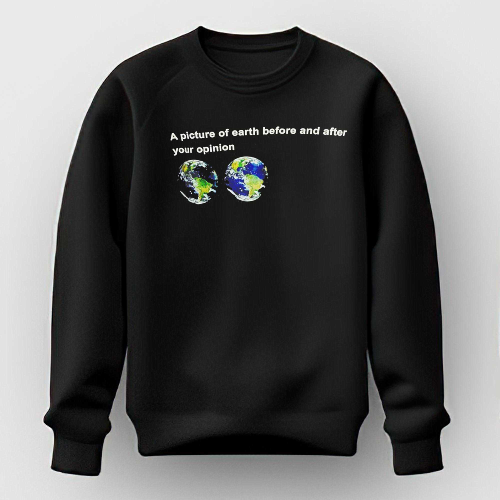 Show off your realistic perspective on life with a design that is as smart as it is simple. Don’t let your style be dictated by the crowd—wear something that actually says what you’re thinking. This is more than just a graphic tee; it’s a badge of intellectual independence. Elevate your daily rotation with a touch of galactic humor today. Secure your unique look and buy the A Picture Of Earth Before And After Your Opinion Tee right now!