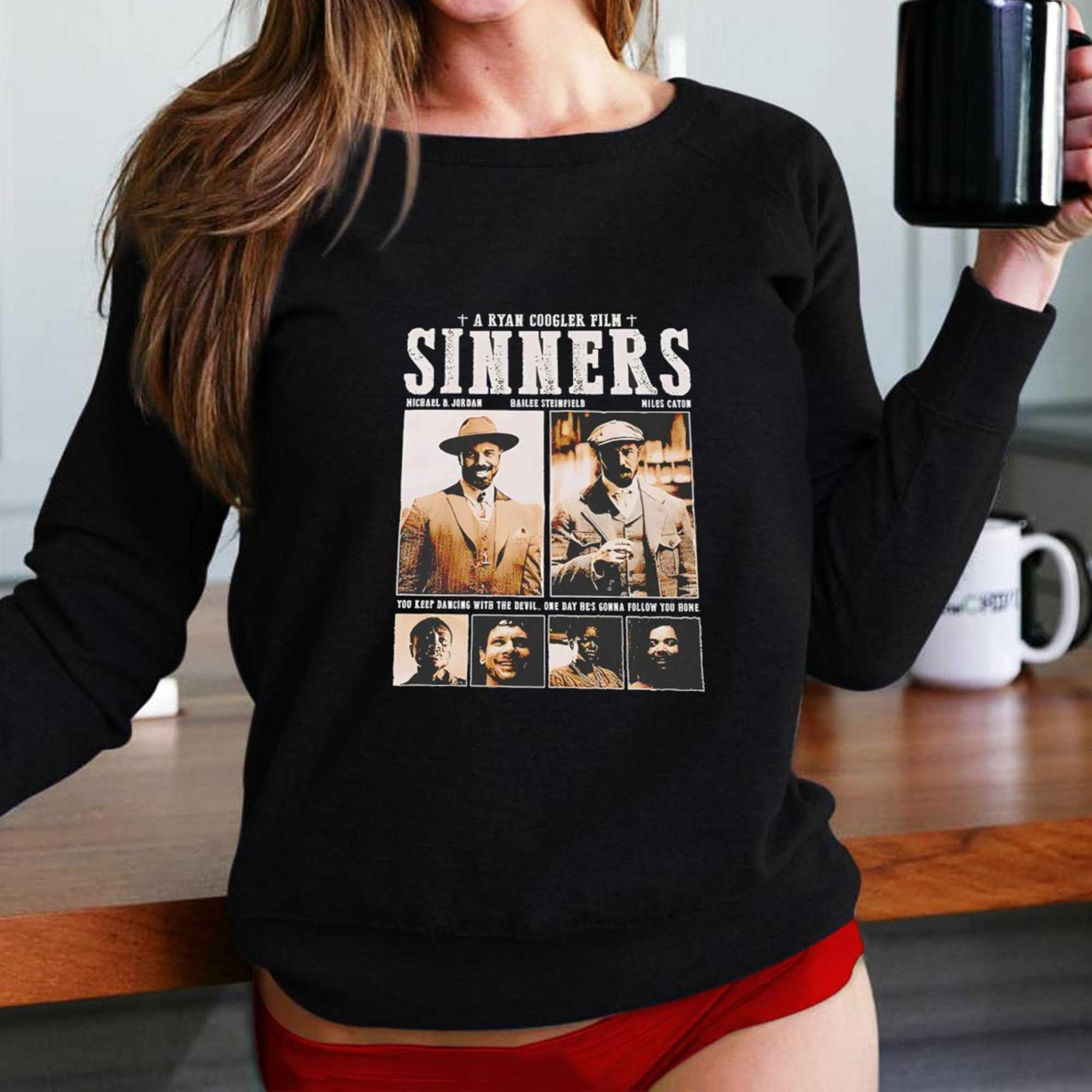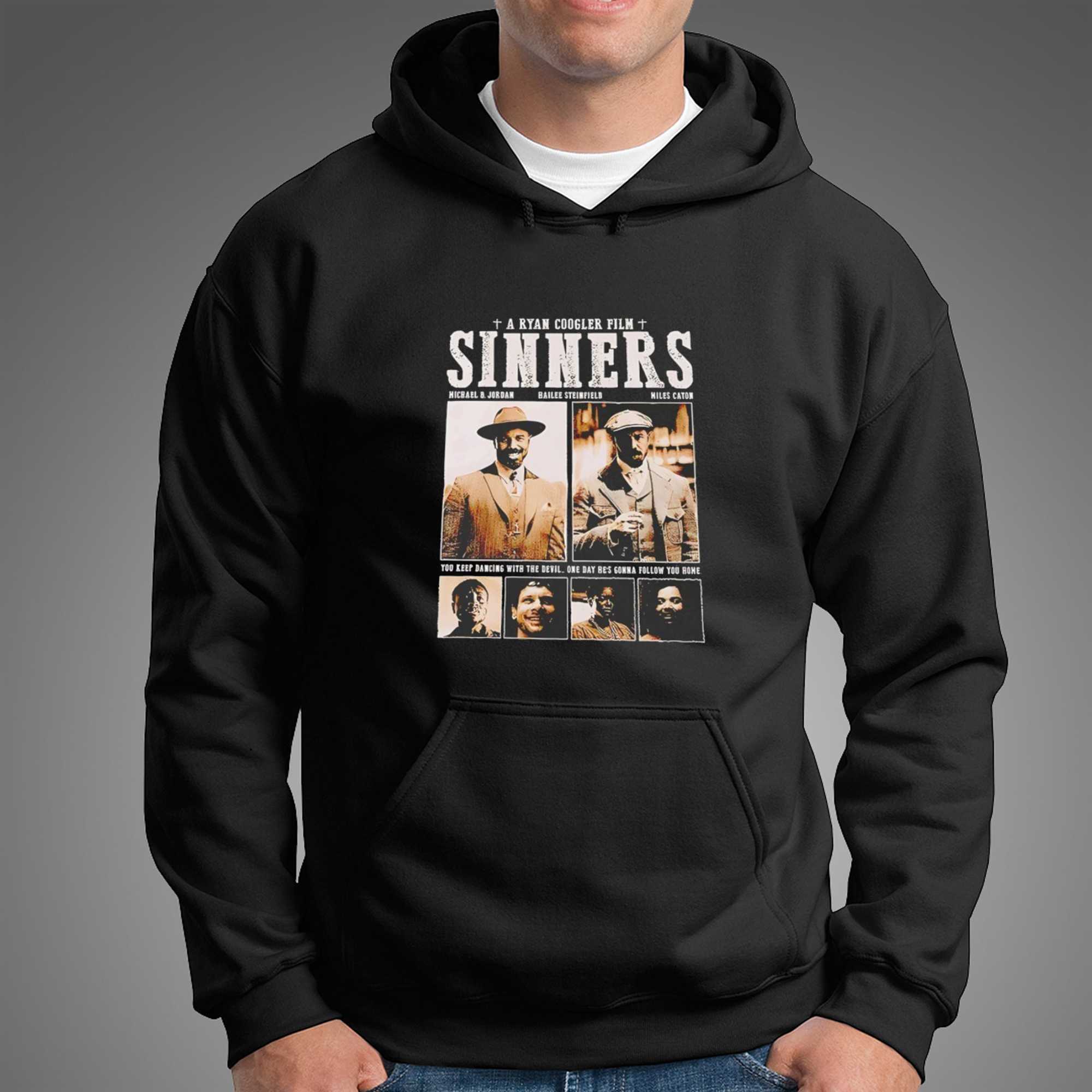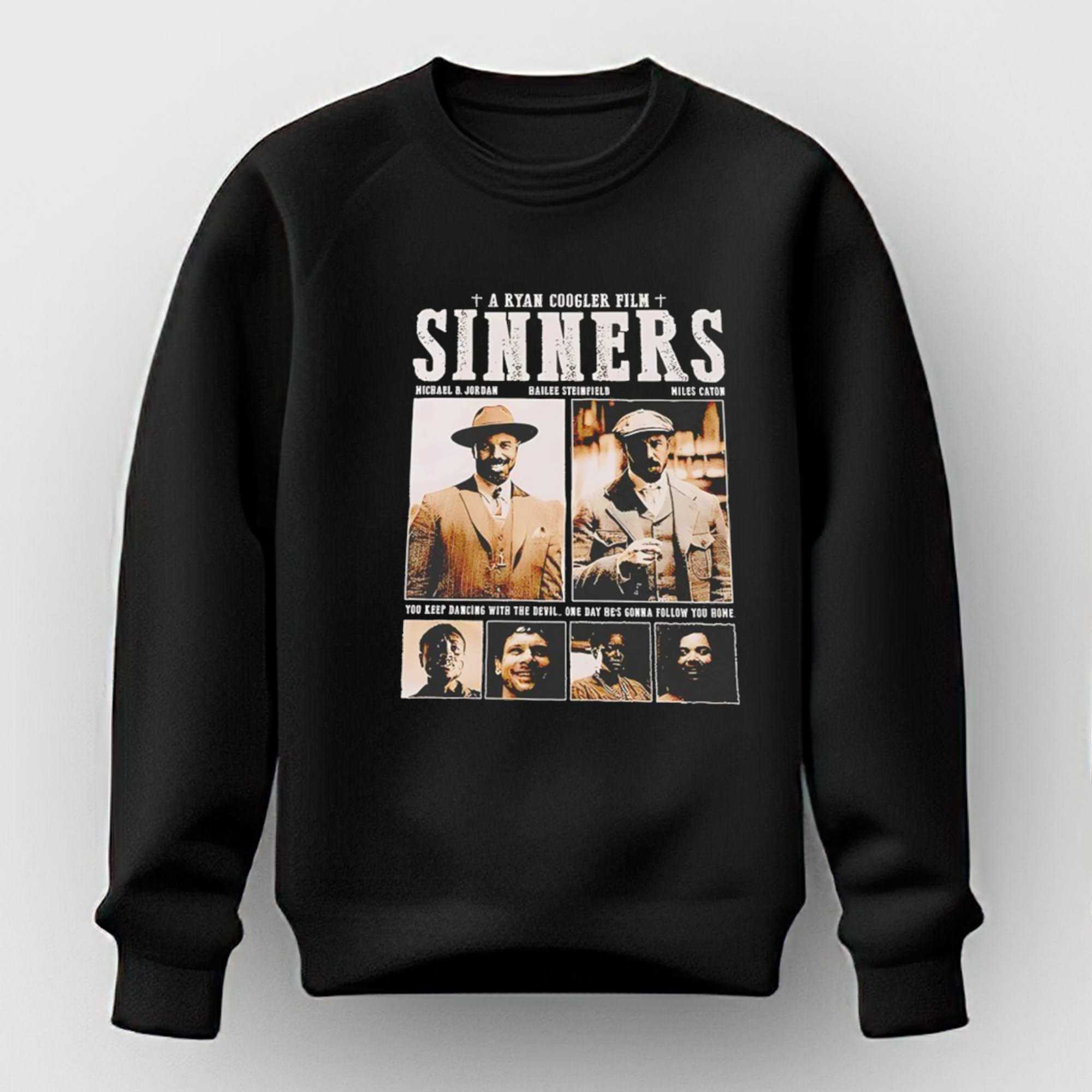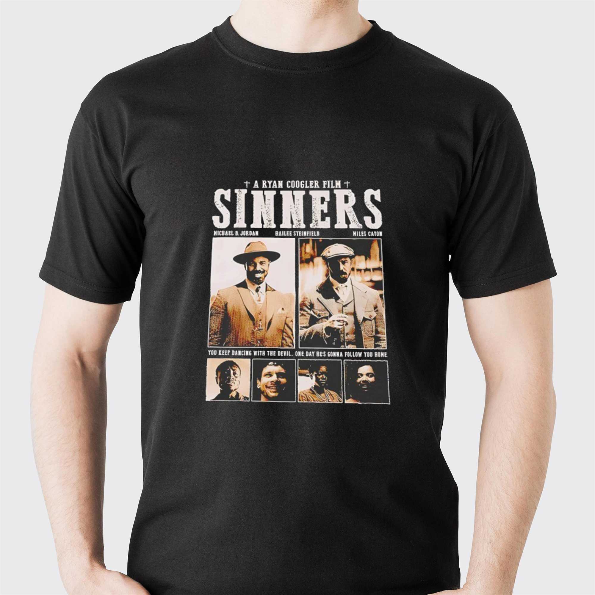 Unleash your inner film buff with the “A Ryan Coogler Film Sinners Tee,” a brilliant visual ode to classic cinema reimagined. This unique design meticulously crafts a vintage-style movie poster, featuring ‘A RYAN COOGLER FILM’ flanked by solemn crosses at the top, leading into the gritty, distressed white title ‘SINNERS.’ Below, the credits list actors Michael B. Jordan, Hailee Steinfeld, and Miles Caton, accompanied by two prominent sepia-toned portraits of men in period attire—one clearly Michael B. Jordan sporting a fedora and a confident smile, the other a stern-faced gentleman in a flat cap. Further down, four smaller, equally evocative sepia-toned portraits of diverse characters add depth, all framed by the ominous, retro-font quote: “YOU KEEP DANCING WITH THE DEVIL. ONE DAY HE’S GONNA FOLLOW YOU HOME.” This design humorously blends modern cinematic talent with the dark, dramatic aesthetic of a classic western or crime thriller, creating a compelling, fictional film universe right on your chest.