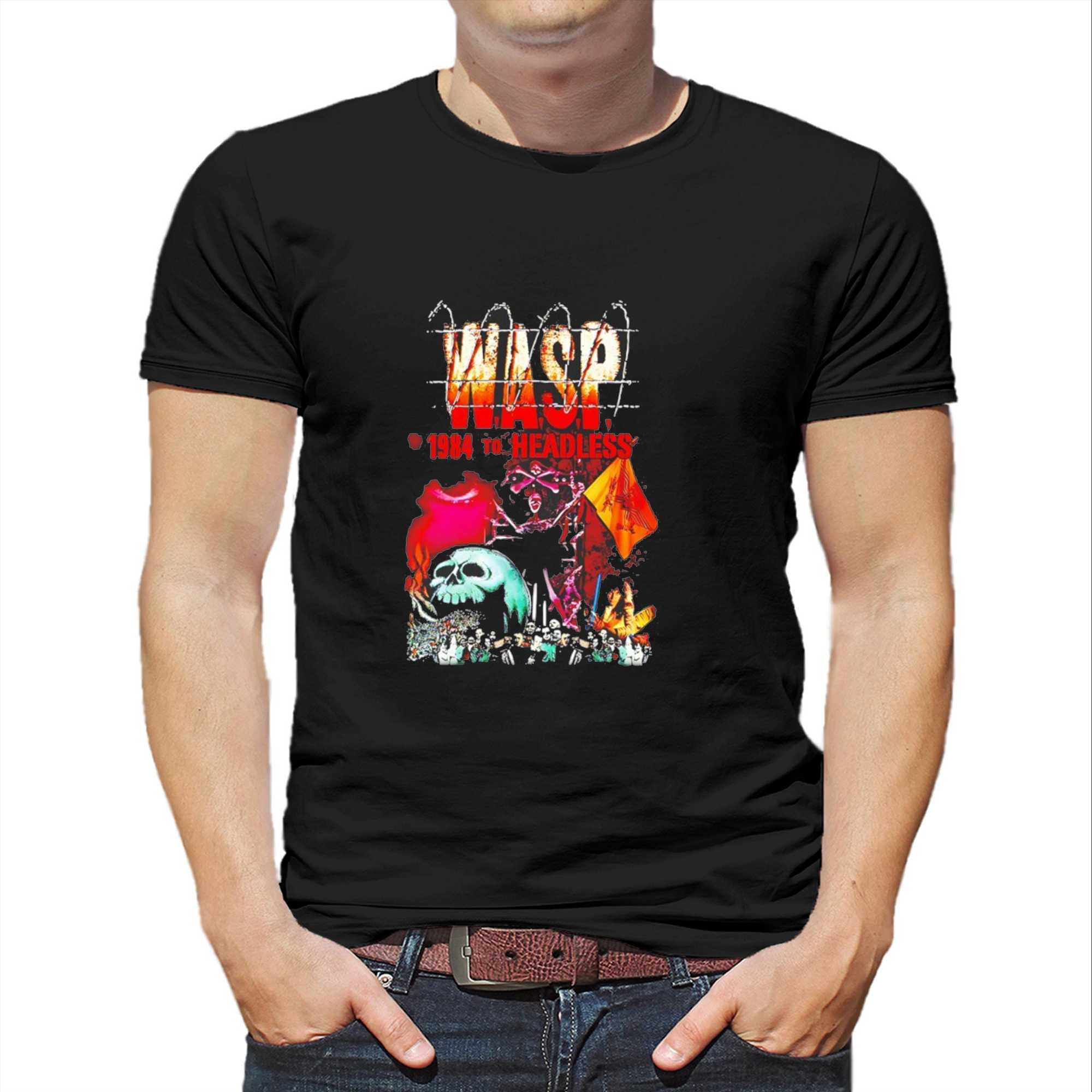 Get ready to rock with the A.s.p 1984 To Headless Tee! This iconic design isn’t just a shirt; it’s a mosh pit of metal history. Dominated by the distressed, barbed-wire-laden “W.A.S.P.” logo in gritty white and orange, it boldly declares “1984 to HEADLESS” in blood-red text, marking a legendary era. Below, a chaotic tableau unfolds: a fierce, red-hued figure with crossed bones clutches a burning yellow flag, while a striking teal-green skull, jaw agape and emitting fiery red smoke, presides over a tumultuous crowd of abstract figures. It’s a vibrant, visceral tribute to the raw power and unforgettable imagery of classic heavy metal, perfect for those who live and breathe the genre’s rebellious spirit.