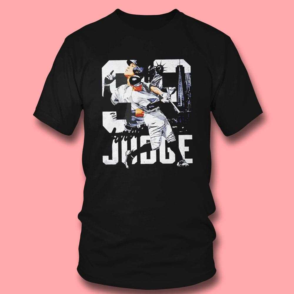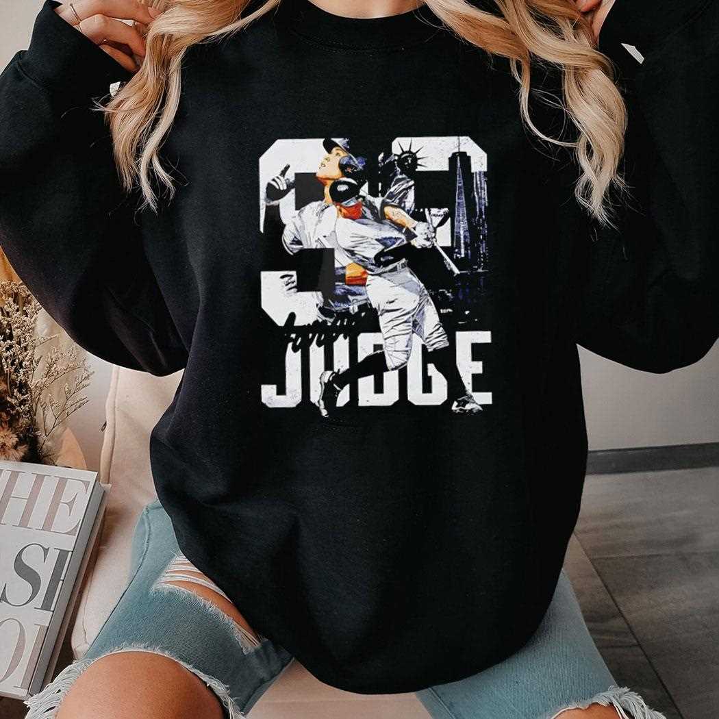 All rise for the captain! This powerful t-shirt is a tribute to the New York Yankees’ superstar slugger, Aaron Judge. The dynamic, black-and-white action shot and the bold “JUDGE” text make this a must-have for any fan of the Bronx Bombers. Here comes the Judge! Show your support for one of the most dominant players in the game with this epic tee. A home run for any Yankees fan’s wardrobe..