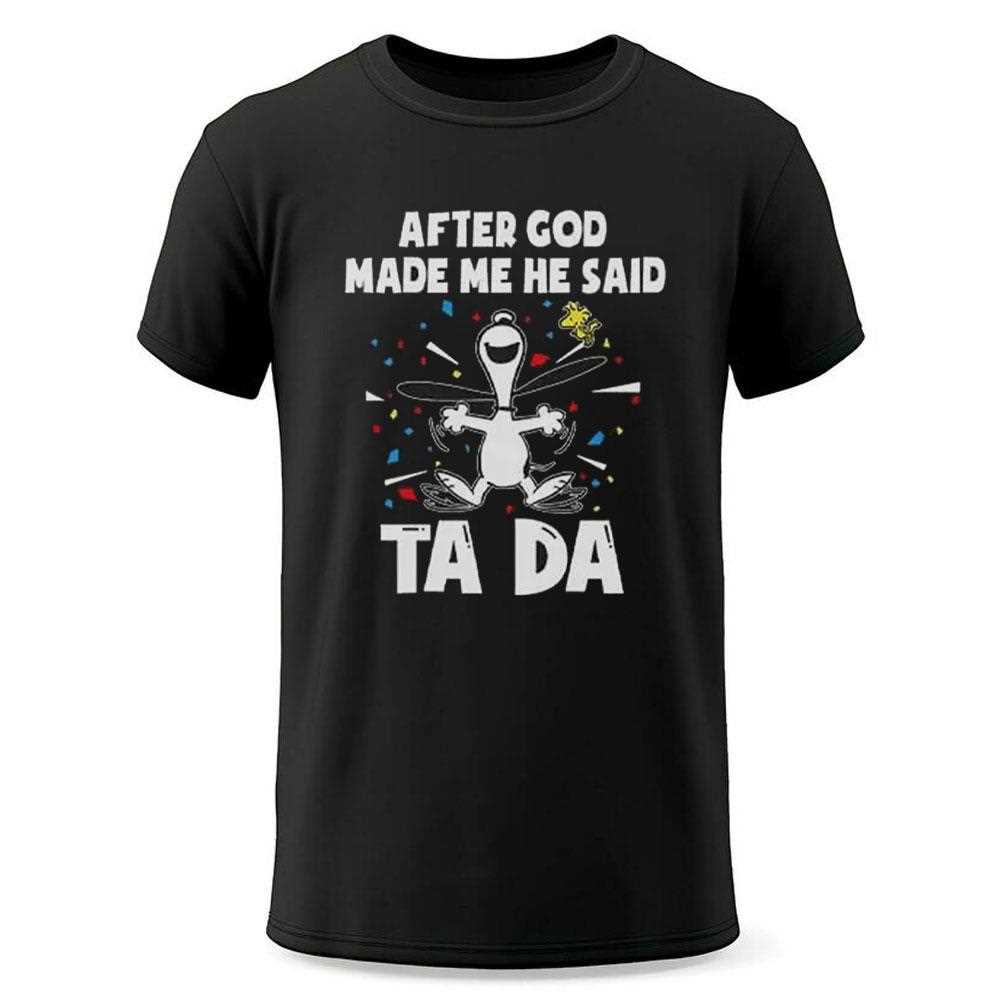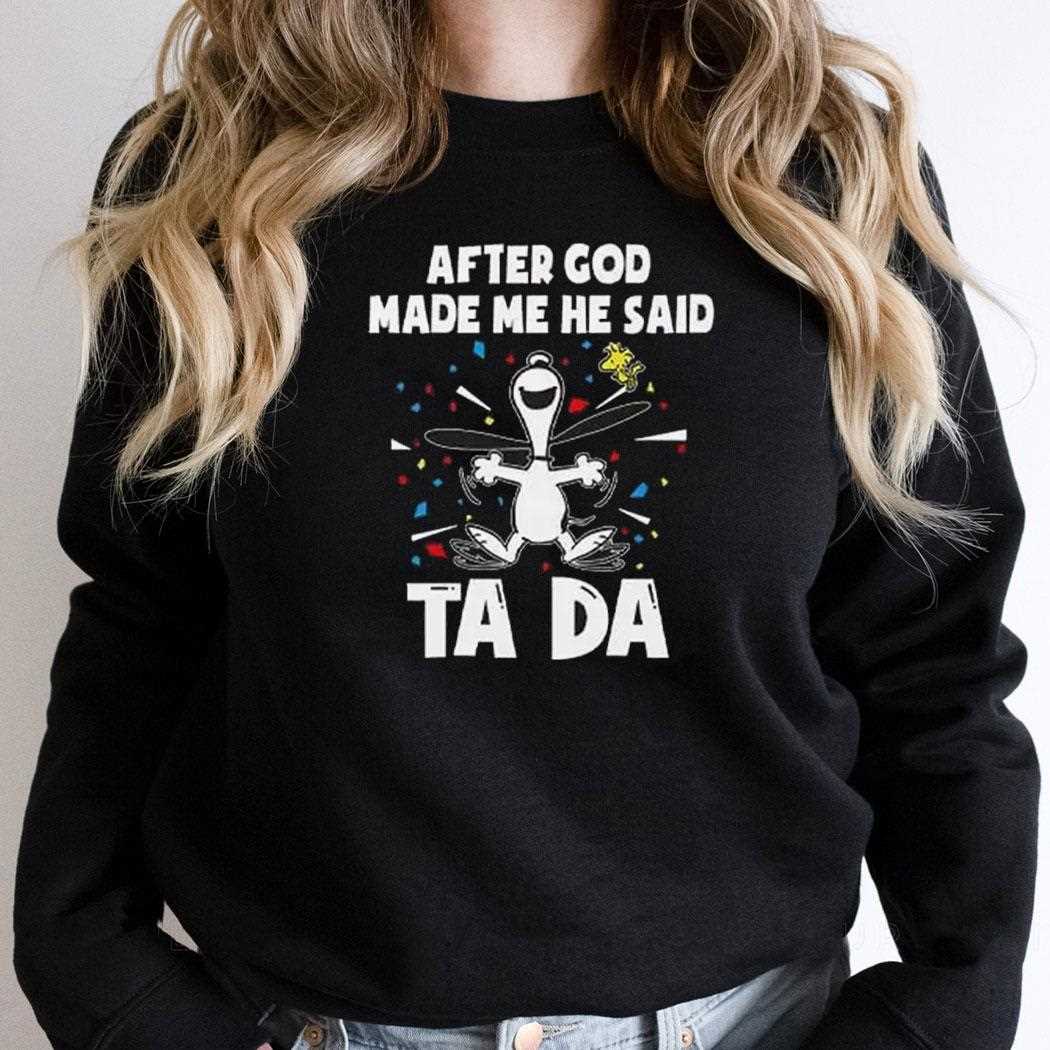 .The “After God Made Me He Said Tada Snoopy Shirt” is more than just a piece of clothing; it’s a statement of individuality and joy. This shirt captures the essence of self-love and confidence with a playful nod to the beloved character, Snoopy.