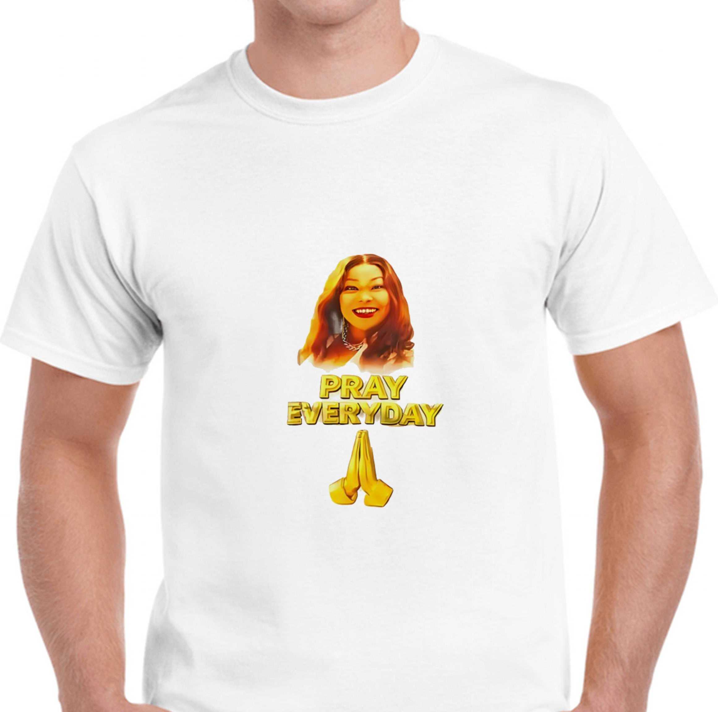 The Agradaa Pray Everyday Tee brings a unique blend of vibrant personality and a timeless spiritual message right to your wardrobe. This captivating design features a smiling woman with radiant reddish-brown hair, bright red lips, and a gleaming silver chain, positioned prominently at the top. Below her joyful countenance, the powerful phrase “PRAY EVERYDAY” gleams in striking, gold-hued 3D lettering, commanding attention. Completing this eye-catching layout, a pair of elegantly rendered golden praying hands rests beneath the text. It’s a bold, witty statement that playfully merges an iconic figure with a universally recognized call to daily devotion, inviting conversations and smiles wherever you go.