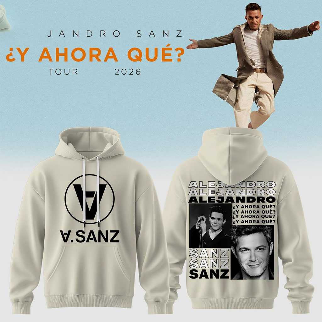 The Alejandro Sanz Tour 2026 Y ahora que Hoodie Tee isn’t just apparel; it’s a vibrant shout-out to your favorite artist, cleverly designed for the ultimate fan! This cream-colored garment proudly displays a bold black circular logo with a stylized ‘V’ or inverted ‘A’ and “V.SANZ” in black text on the front, offering a clean, iconic statement. Turn around, and the party begins with a dynamic black and white collage on the back. “ALEJANDRO” repeats thrice at the top in a staggered black block font, followed by two striking portraits of Sanz – one performing with a mic, humorously paired with “¿Y AHORA QUE?” repeated three times, hinting at a famous lyric or track, and another close-up of his charismatic smile, flanked by “SANZ” repeated thrice. It’s a playful, artful tribute, blending his name, iconic query, and powerful imagery.
