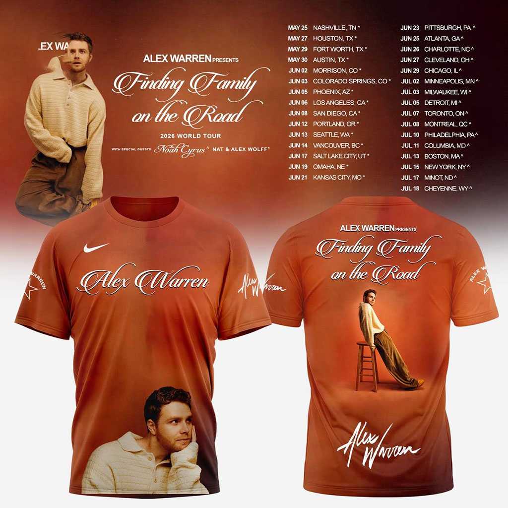 “Alex Warren Finding Family on the Road 2026 Hoodie Tee” isn’t just apparel; it’s a vibrant wearable concert poster that captures the spirit of connection and adventure! This striking design bathes in warm, earthy terracotta and amber hues, featuring a bold white Nike swoosh and elegant script lettering that proclaims “Alex Warren” on the front, framing a thoughtful image of Alex himself. The back proudly displays the tour title “Finding Family on the Road” above another evocative full-body portrait of Alex leaning on a stool, all underscored by his distinct signature. White star accents with ‘WARREN’ and ‘ALEX W’ adorn the sleeves, completing this unique homage to Alex Warren’s journey and his search for connection on the road, creating a perfect blend of fan enthusiasm and artistic expression.