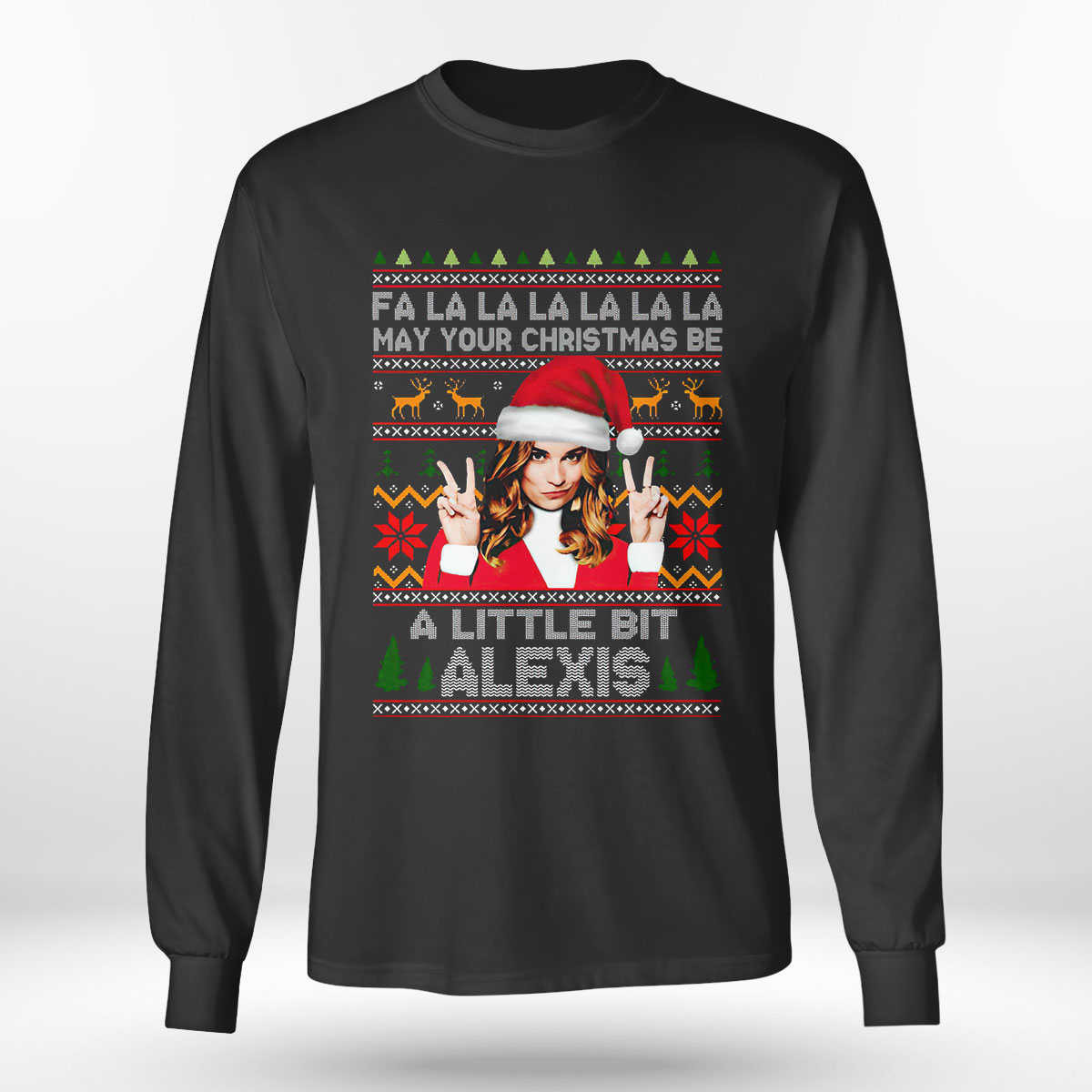 The Alexis Fa la la la la la may your Christmas be a little bit Alexis ugly Christmas sweatshirt is a stylish, comfy shirt. Made of 100% cotton, it is cool and soft and keeps you cool in summer days. This edgy shirt comes in different colors, but the black stands out the most and matches with everything. It has many uses like casual wear, party wear, office wear and much more.