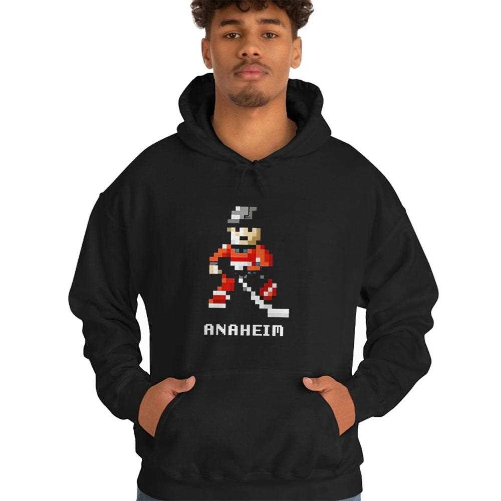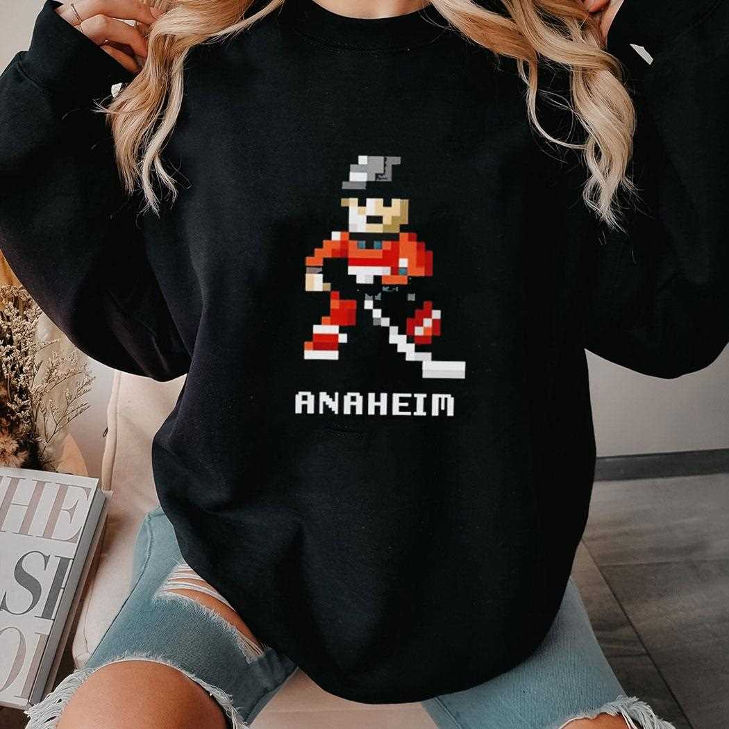 Take a trip back to the 8-bit era with this nostalgic masterpiece. The design features a pixelated hockey player clad in the classic Anaheim colors of orange, black, and gold. The blocky art style is reminiscent of classic NES sports games, appealing to both hockey fans and retro gamers. The player is frozen in a pixel-perfect shooting pose, ready to score a goal. The text “ANAHEIM” is rendered in a chunky, arcade-style font that complements the visual theme perfectly. It’s a fun, playful take on sports merchandise that stands out from standard team logos. The simplicity of the pixel art combined with the striking color contrast makes this shirt a unique casual wear item.