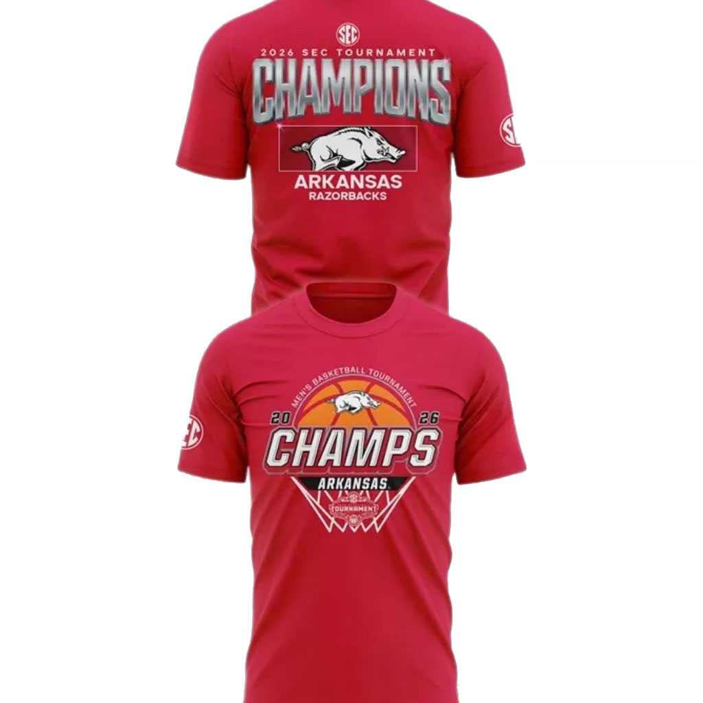 Get ready to manifest victory with the “Arkansas Razorbacks 2026 Men’s Basketball Tournament Champions Locket Room Hoodie Tee”! This bold red apparel design is a hilarious pre-celebration, depicting a future triumph that’s sure to turn heads and spark conversations. The front features a vibrant graphic with “20” on the left and “26” on the right, framing “CHAMPS” in prominent silver lettering, all above “ARKANSAS RAZORBACKS” with their iconic charging hog logo, enclosed within a stylish shield shape. The back mirrors this confidence, boldly proclaiming “2026 SEC TOURNAMENT CHAMPIONS” in large silver letters with the fierce Razorback logo and “ARKANSAS RAZORBACKS” below. It’s a playful, confident declaration of future glory, celebrating the Hogs’ inevitable dominance years in advance!