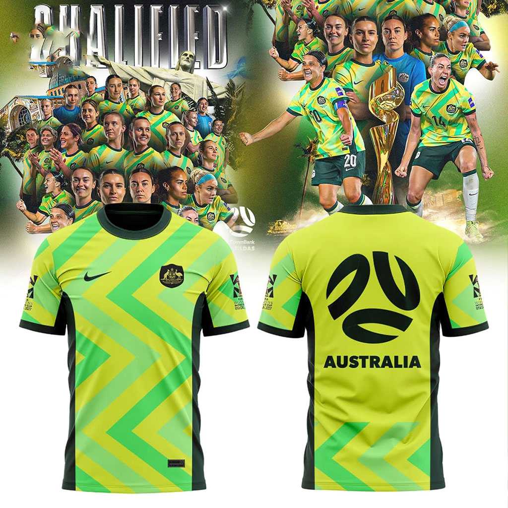 Celebrate their incredible journey with the Australia’s National Women’s Football Team FIFA Women-s World Cup 2027 Hoodie Tee! This vibrant design is a triumphant shout-out to the Matildas’ qualification, featuring a dynamic collage of the team in action and celebrating, all against a subtly illustrated backdrop hinting at host nation Brazil. Dominating the upper section is the bold, metallic-effect text “QUALIFIED,” announcing their success. The striking hoodie itself boasts a lively lime green and chartreuse chevron pattern, accented with sharp black detailing on the sides and cuffs. The front proudly displays the iconic Nike swoosh and the Australian Matildas crest, while the back features the distinctive ’20’ (Football Australia) logo and “AUSTRALIA” in bold black text, symbolizing national pride and unwavering team spirit.