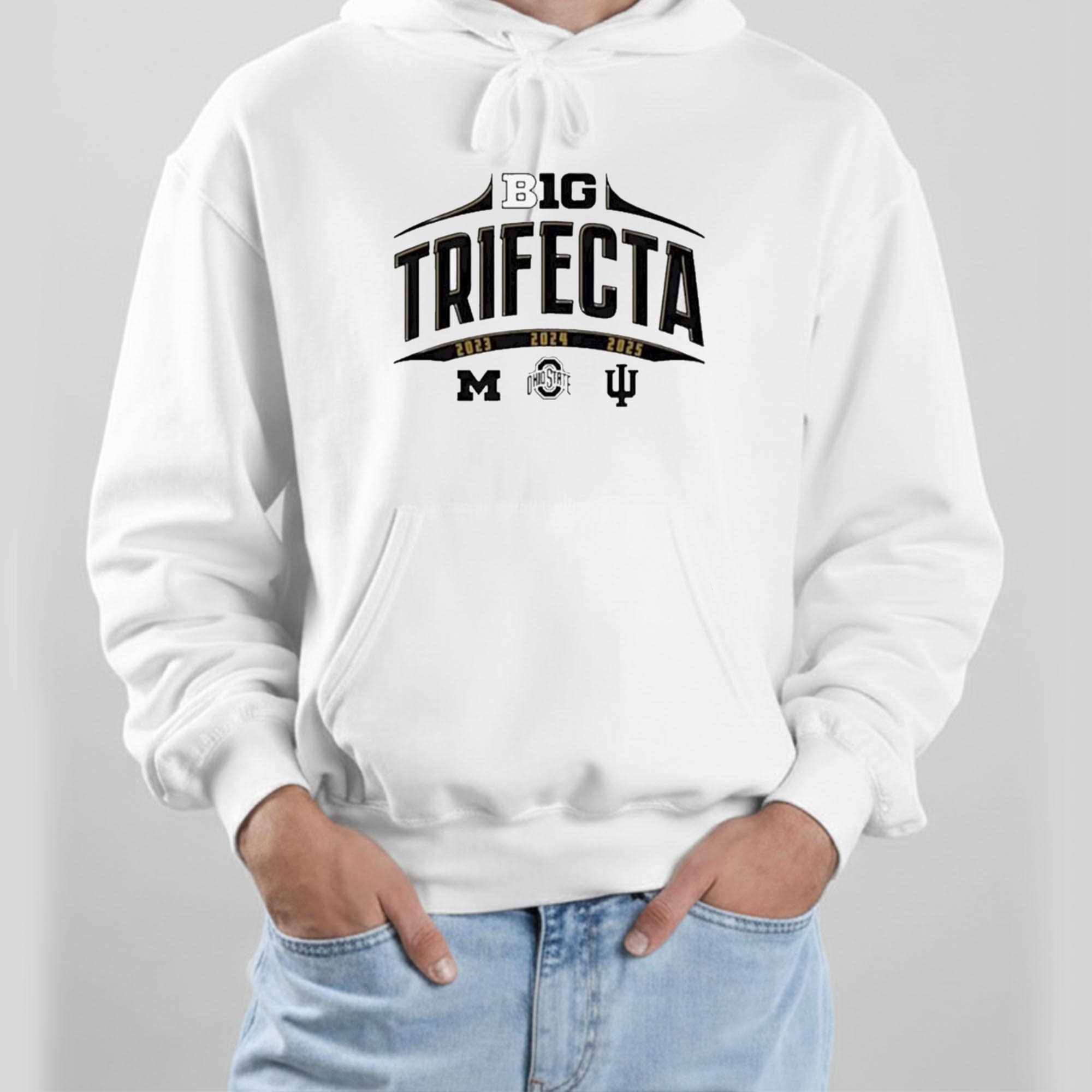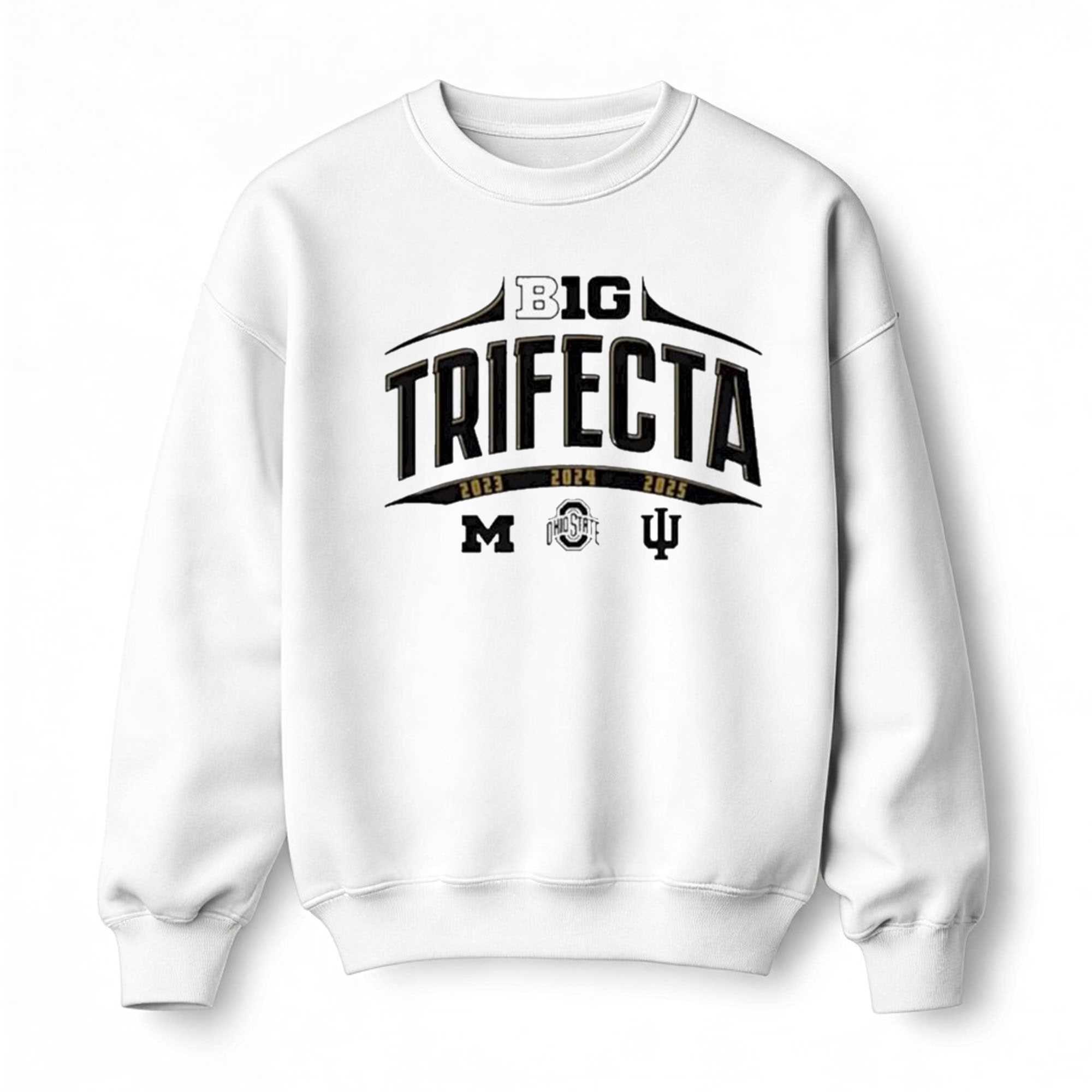 Commemorate an unprecedented era of collegiate dominance with the B1g Trifecta 2023 2024 2025 T-Shirt. This design is a masterclass in athletic storytelling, featuring a prestigious circular crest that celebrates three years of unparalleled success in the Big Ten conference. It is the ultimate memento for those who witnessed history in the making.