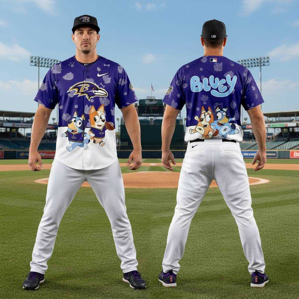 Unleash your inner fan with a wag and a roar in the Baltimore Ravens Bluey Night Baseball Jersey! This wildly imaginative jersey brilliantly merges the spirited world of Bluey and Bingo with the fierce energy of the Baltimore Ravens. The front proudly displays Bluey, the lovable blue heeler, and her sister Bingo, the energetic orange heeler, both sporting purple football jerseys with Bingo playfully clutching a football, all set against a crisp white lower panel. The top half is a vibrant Ravens purple, adorned with an all-over pattern of white paw prints and bones, featuring the iconic “SB” Ravens logo, a white Nike swoosh, and an MLB patch on the sleeve. The back continues the purple background with paw prints and bones, boasting the bold light blue “Bluey” text at the top and a relaxed depiction of Bluey and Bingo lying down, completing a design that’s both adorable and powerfully purple!