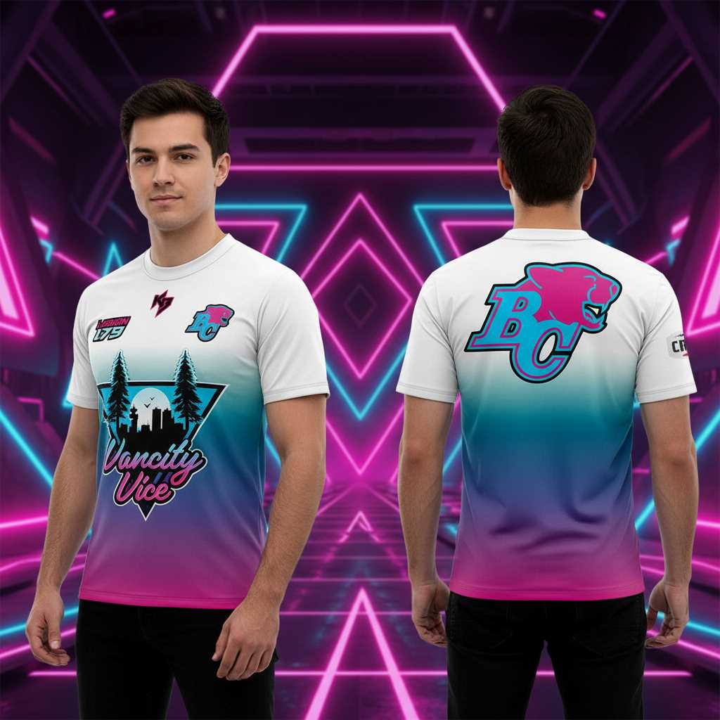 Unleash your inner neon rebel with the BC Lions Vancity Vice Special Hoodie, a vibrant tribute to 80s synthwave aesthetics fused with West Coast cool. This all-over print design electrifies, featuring a dynamic gradient from crisp white, flowing into an electric teal-blue, and culminating in a bold magenta-pink. The front showcases a central inverted triangle framing dark evergreen trees and a sleek city skyline silhouette against a vibrant teal sky, all overlaid with the iconic “Vancity Vice” in a retro-futuristic white font. Smaller graphic badges, including a lightning bolt and a stylized pink and blue BC Lions logo, adorn the upper left chest. The back boasts a prominent, retro-infused blue “BC” logo with a fierce pink panther head integrated into the ‘C’, outlined in eye-catching pink. It’s a playful nod to Miami Vice flair, re-imagined for Vancouver’s unique blend of urban grit and natural beauty.