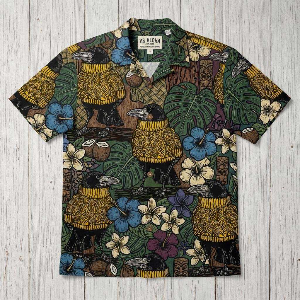 Step into a world where witty charm meets tropical flair with our Bejumpered Raven wearing a mustard yellow jumper Hawaiin Shirt. This design is a true conversation starter, featuring a delightful repeating pattern of cool, black ravens, each sporting a jaunty mustard yellow jumper. These sophisticated birds are set against a rich, deep green background, nestled amidst lush tropical foliage and vibrant blue, purple, and cream-colored hibiscus flowers. Adding to the whimsical scene are intricate, gold-toned woven basket patterns. The humor lies in the unexpected elegance of these casually clad ravens, bringing a touch of quirky intellect to your island-inspired look.
