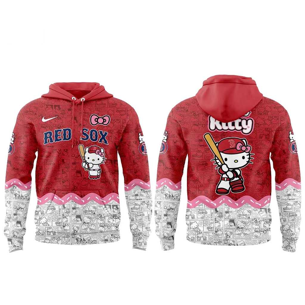 Get ready to hit a grand slam of style with the Best Boston Red Sox Hello Kitty Night Game 2026 Hoodie! This eye-catching apparel brilliantly merges two iconic worlds, featuring a vibrant red body adorned with subtle baseball patterns and adorable Hello Kitty faces. The front proudly displays “RED SOX” in bold blue and white, with Hello Kitty herself ready to swing, dressed in a Red Sox uniform and cap, bat in hand. A playful pink wavy border seamlessly transitions to the lower white section and sleeves, which are covered in charming black-and-white Hello Kitty comic strip panels. The back echoes this delightful theme, showcasing Hello Kitty in her baseball gear again, with “Kitty” elegantly scripted above. This design is a humorous, unique celebration of fandom, perfect for those who love unexpected crossovers and a future “Night Game 2026” event.