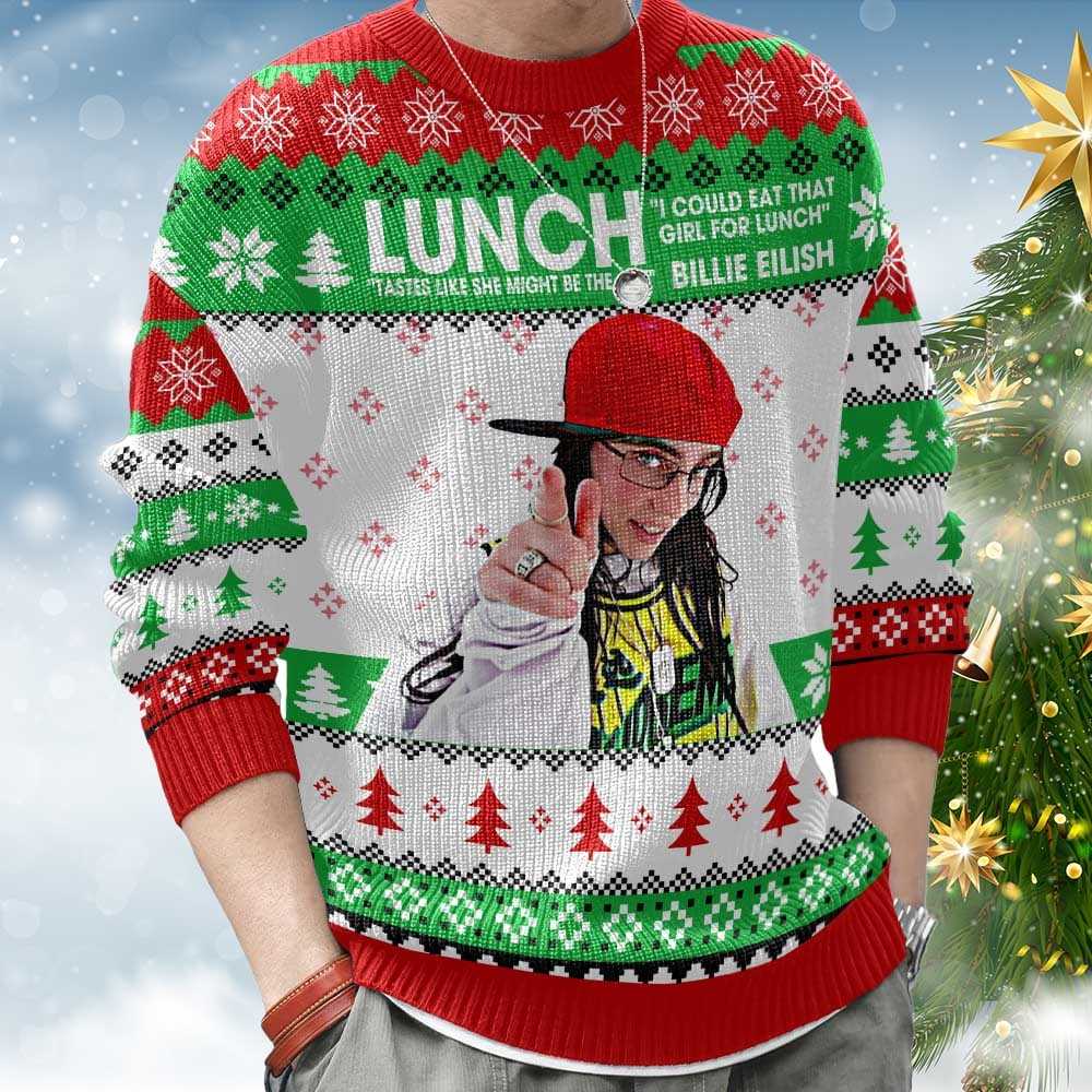 .If you’re looking to make a bold statement this holiday season, the Billie Eilish “I Could Eat That Girl For Lunch” Christmas Ugly Sweater is the perfect choice. This unique piece combines humor and style, capturing the essence of Billie’s edgy persona while embracing the spirit of Christmas.
