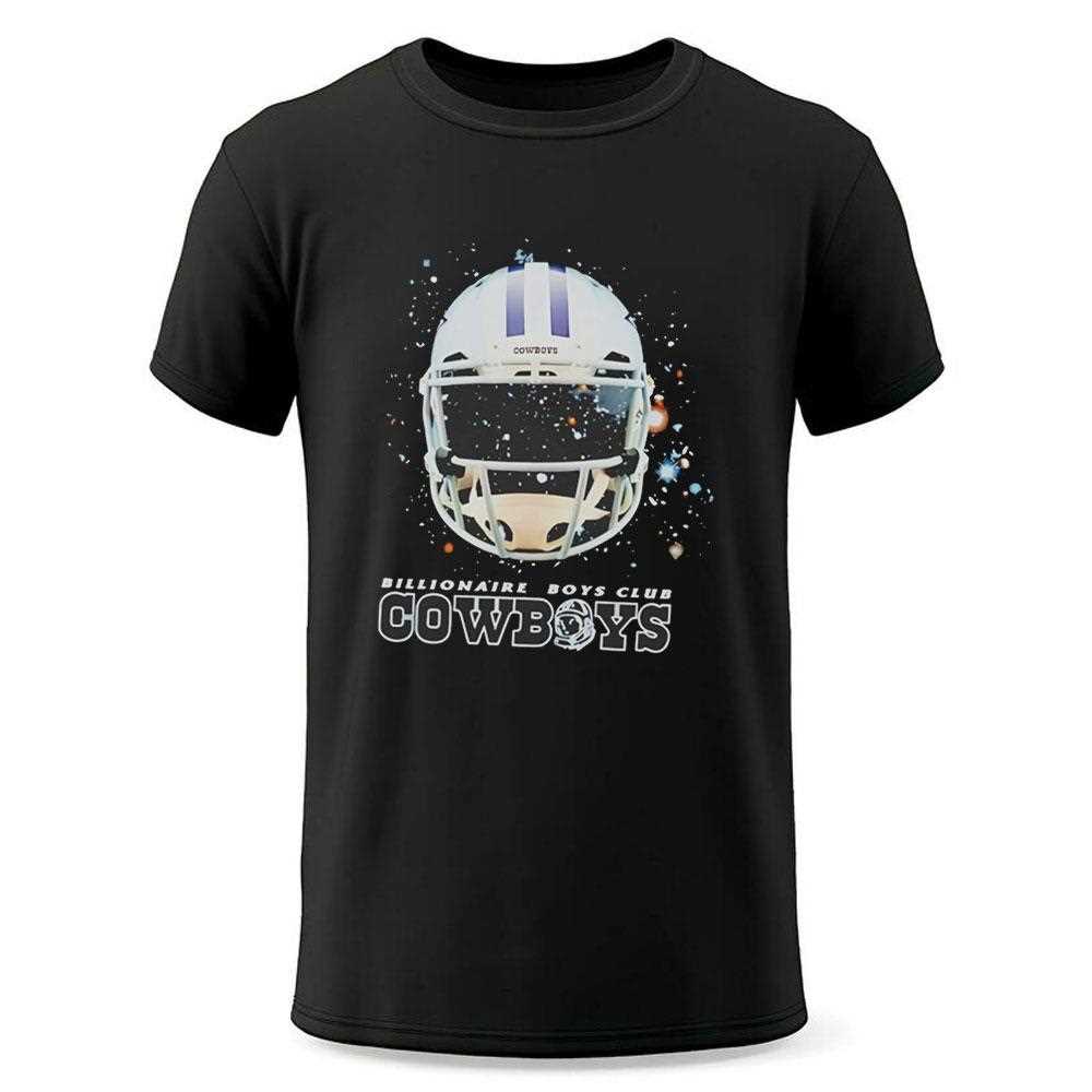 Elevate your style game to intergalactic levels with this stunning fusion of high-end streetwear culture and NFL tradition. This design represents a bold collaboration of aesthetics, featuring the iconic Billionaire Boys Club astronaut motif seamlessly integrated with the legendary Dallas Cowboys star. The centerpiece of the shirt is a hyper-detailed graphic of a space helmet, but instead of a simple reflection, the visor gleams with the unmistakable blue and white lone star of Dallas.