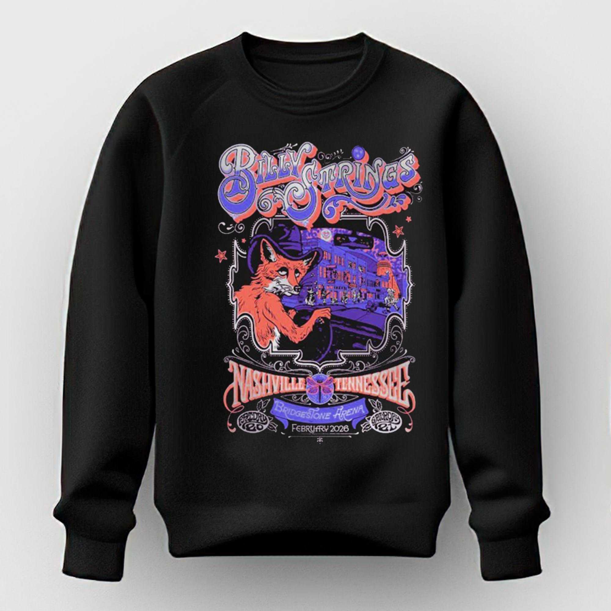 Relive the magic of a legendary night in the heart of Music City with the Billy Strings Bridgestone Arena Feb 20 Tee. This design is a visual masterpiece, capturing the high-octane energy and psychedelic soul of a Billy Strings performance. The central graphic features a stunning, atmospheric illustration inspired by the concert’s official poster art, utilizing a vibrant palette of purples, oranges, and deep blacks to mirror the improvisational spirit of bluegrass music.
