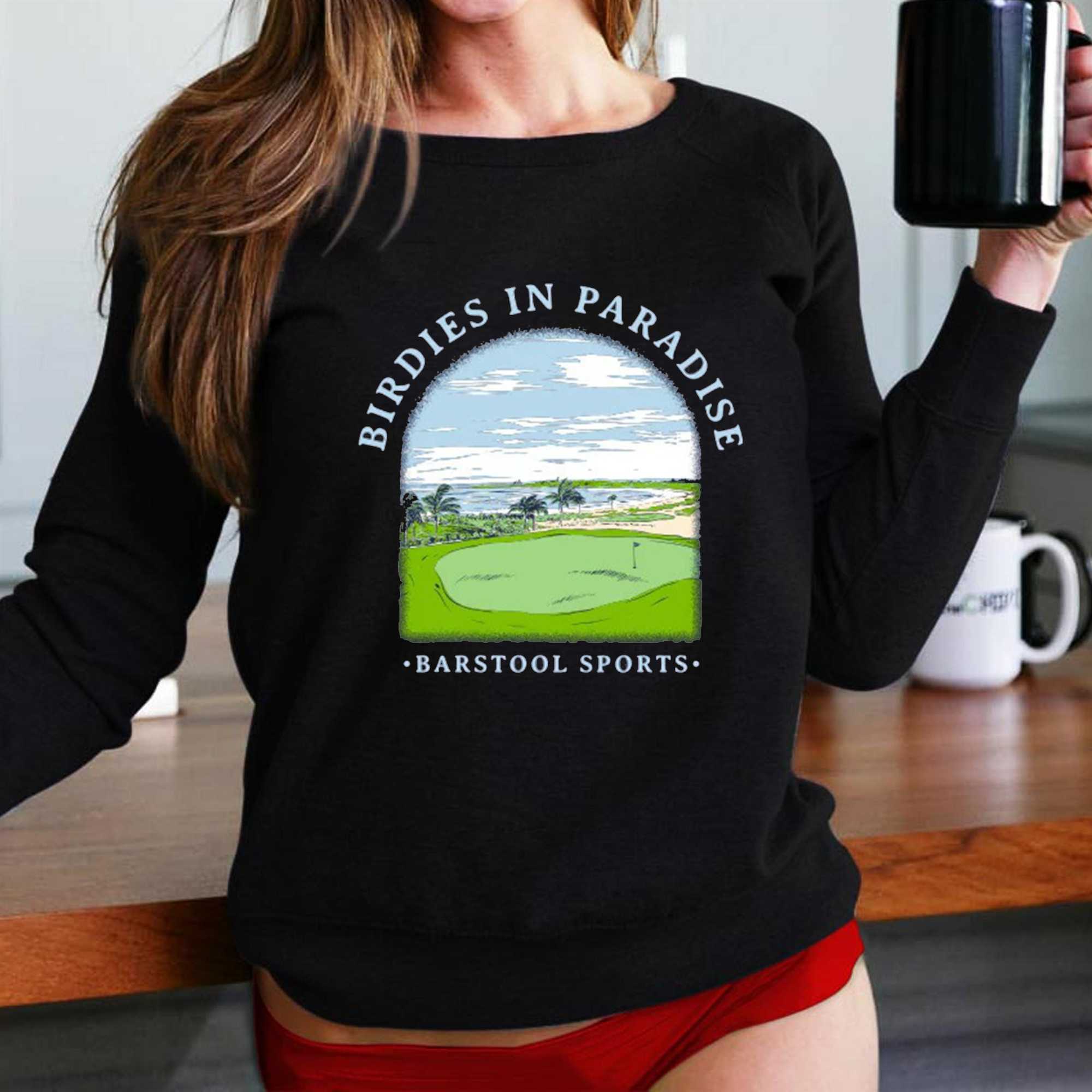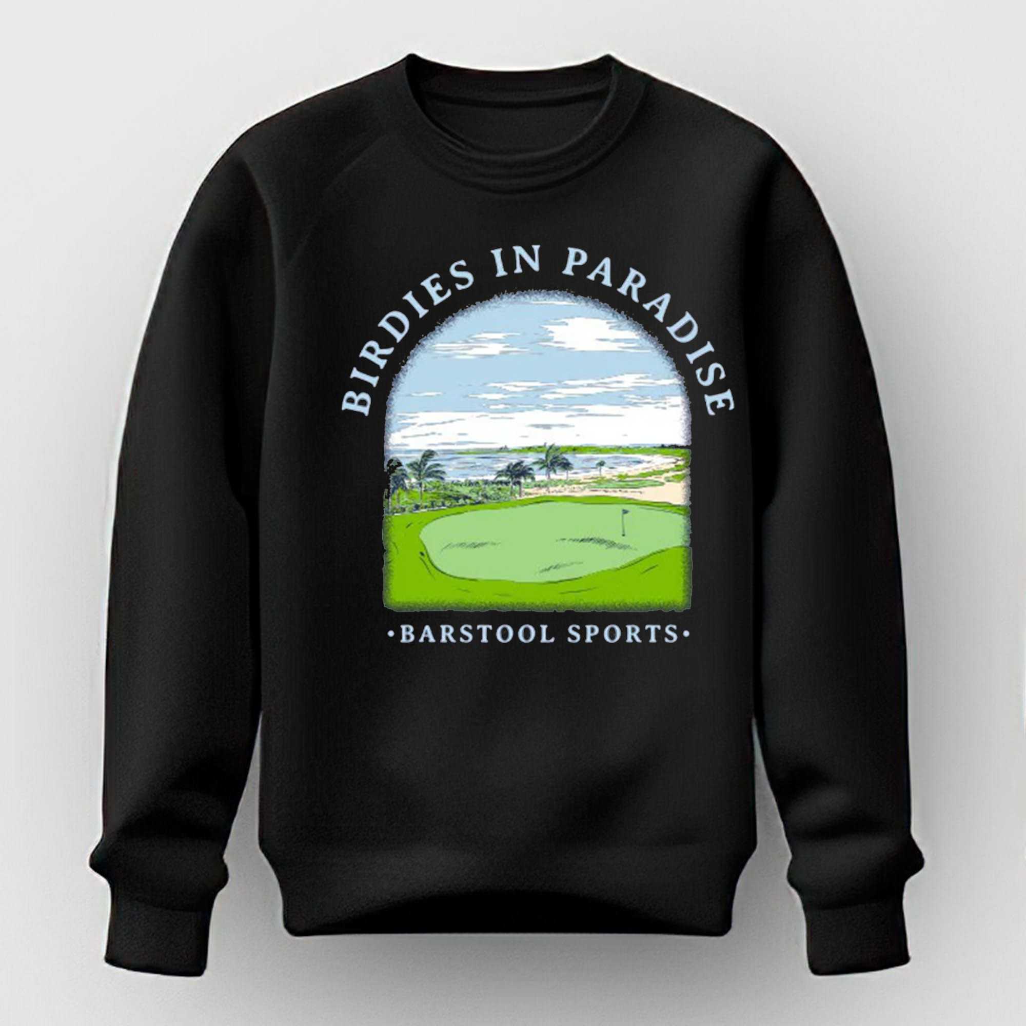 The Birdies In Paradise Shirt is your ticket to a golf getaway, even if it’s just in your dreams. This captivating design features a distressed, arched frame that perfectly encapsulates a vibrant tropical golf landscape. The scene unfolds with a pristine green putting surface and flagstick in the foreground, gently sloping fairways, swaying palm trees, a tranquil sandy beach, and a calm expanse of light blue ocean beneath a bright, cloudy sky. Arched above, the words “BIRDIES IN PARADISE” in a charming light blue hue evoke aspirational golf moments, while “BARSTOOL SPORTS” subtly anchors the design below. It’s a whimsical tribute to the ultimate golf escape, blending the thrill of the game with serene island vibes.