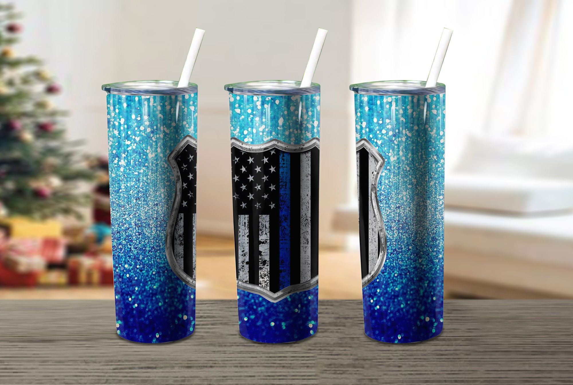 Blue Glitter Police Flag Thin Blue Skinny Tumbler
