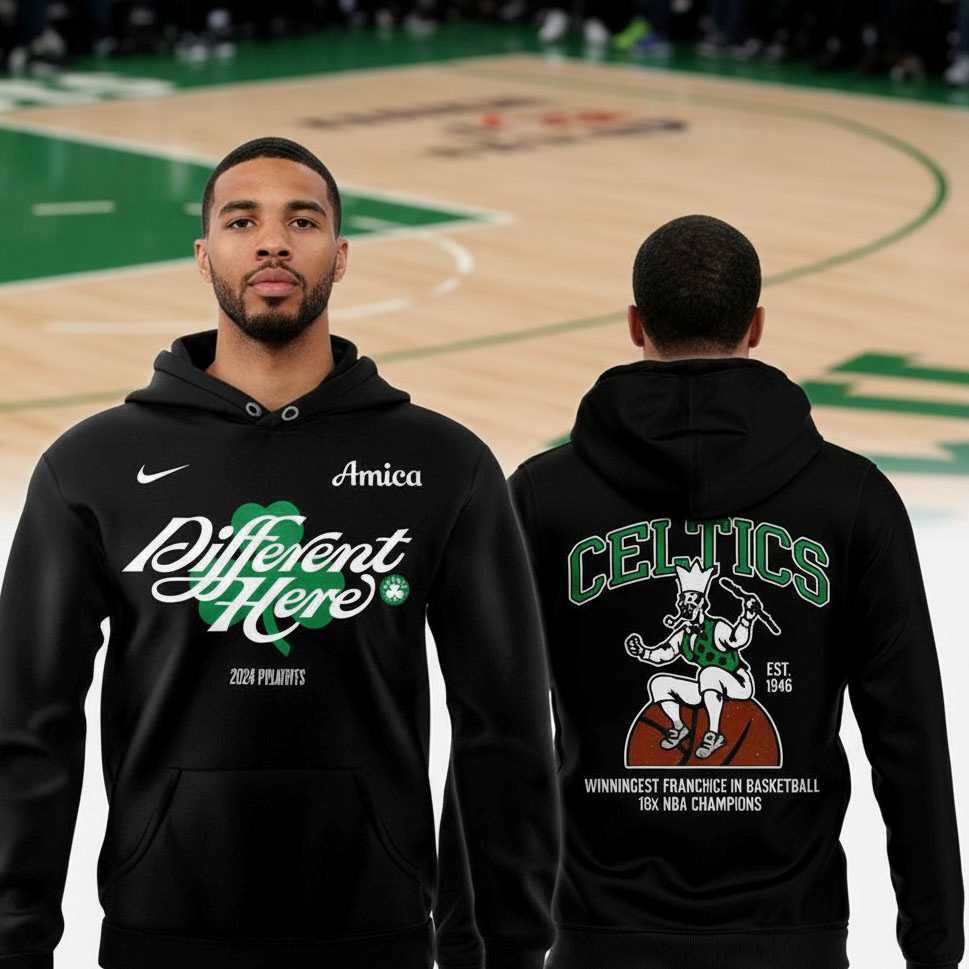 Represent the winningest franchise in NBA history with the Boston Celtics 2026 Playoffs Different Here NBA All Black Tee Hoodie. This sleek, all-black hoodie captures the intense focus of the Celtics’ playoff run, featuring the “Different Here” slogan in a vibrant Celtic green. It’s a minimalist yet powerful design that speaks to the unique culture and championship expectations of Boston basketball.
