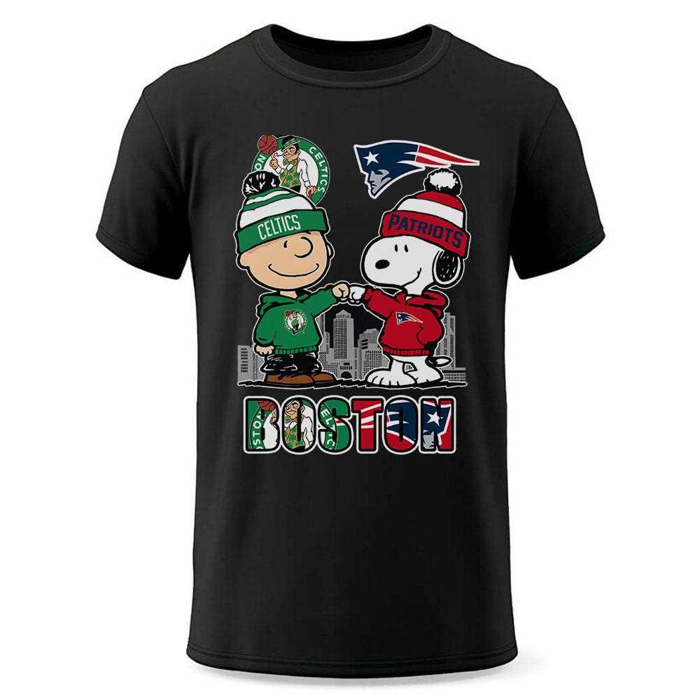 The design is a masterstroke, flawlessly blending the iconic visual language of Peanuts with the dynamic spirit of two championship-winning franchises. Imagine the cool, confident swagger of a Celtic, perhaps embodied by Snoopy, rocking the classic green and white, ready to dribble his way to victory on the court. Alongside him, the unwavering determination of a Patriot, perhaps Charlie Brown with his earnest spirit, proudly wearing the red, white, and blue, ready to tackle any challenge on the gridiron. The centerpiece is the heartwarming fist bump shared between these two beloved characters, a powerful symbol of unity, mutual respect, and the shared passion for Boston sports. It elegantly transcends the individual sports, creating a unifying image that resonates with any true New England fan. The vibrant team colors are rendered with exquisite detail, making the logos and uniforms instantly recognizable and adding a playful yet powerful punch to the overall aesthetic. This graphic is not merely printed; it’s an integrated piece of art that speaks volumes about loyalty and local pride.