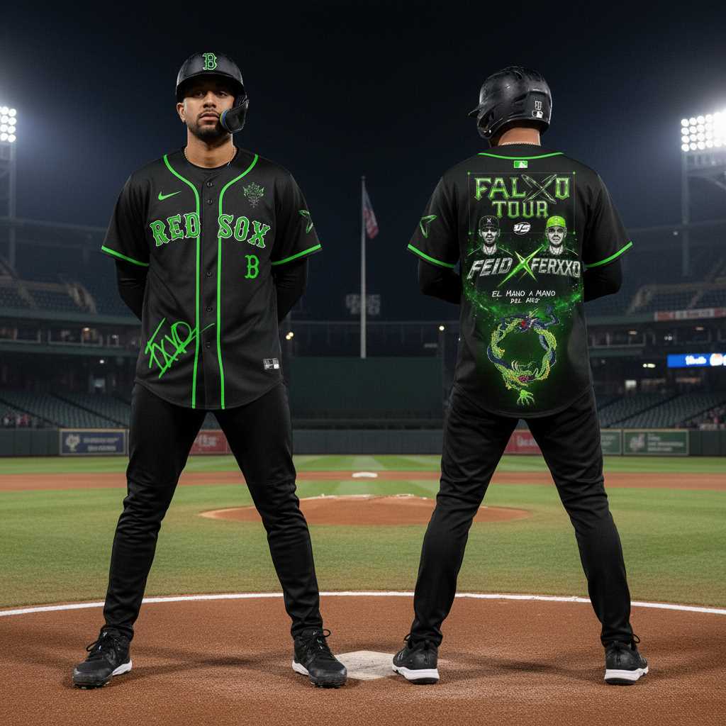 Step up to the plate with the ultimate crossover collectible, the Boston Red Sox FEID vs FERXXO Falxo Tour 2026 Baseball Jersey. This isn’t just a jersey; it’s a vibrant cultural collision on a bold black backdrop accented with electrifying neon green. The front proudly displays “RED SOX” in striking green, with the iconic “B” logo and a unique “FXRXXO” signature scrawled near the lower left hem. The back unveils the “FALXO TOUR” header, showcasing Feid and Ferxxo in a “VS” battle, underlined by “FEID X FERXXO” and “EL MANO A MANO DEL AÑO.” Below, a mesmerizing neon green dragon forms an ouroboros, symbolizing an epic, cyclical showdown. This design humorously blends baseball heritage with music’s hottest rivalry, creating a unique statement for fans of both worlds.
