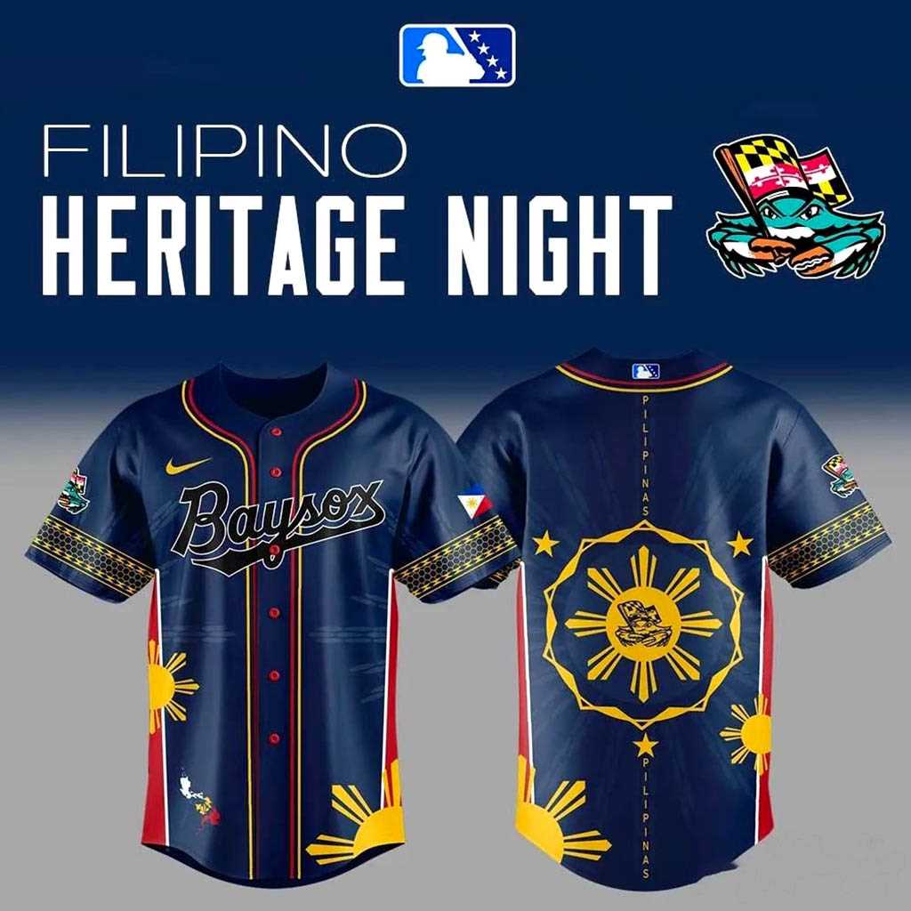 Get ready to hit a home run for heritage with the Bowie Baysox Filipino Heritage Night 2026 Jersey! This striking navy blue uniform beautifully merges team spirit with vibrant Filipino pride. The front proudly displays “Baysox” in elegant script, accented by bold red stripes down the full-button placket and a radiant yellow sun emblem on the lower left. Each sleeve boasts intricate gold patterned trim, featuring subtle red and blue triangular accents, culminating in a miniature Philippine flag patch on the left arm. The back is a breathtaking tribute, showcasing a grand yellow sun surrounded by stars, flanked by a vertical “Filipino Heritage Night 2026” text and two smaller suns at the bottom, all framed by dynamic red side panels. It’s a visually rich celebration, blending iconic Filipino symbols with classic baseball aesthetics for a truly unique statement.