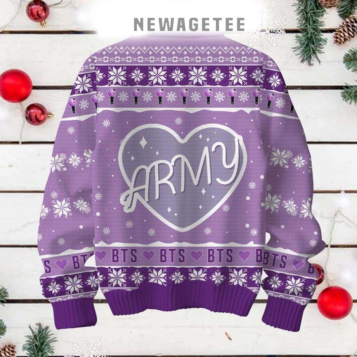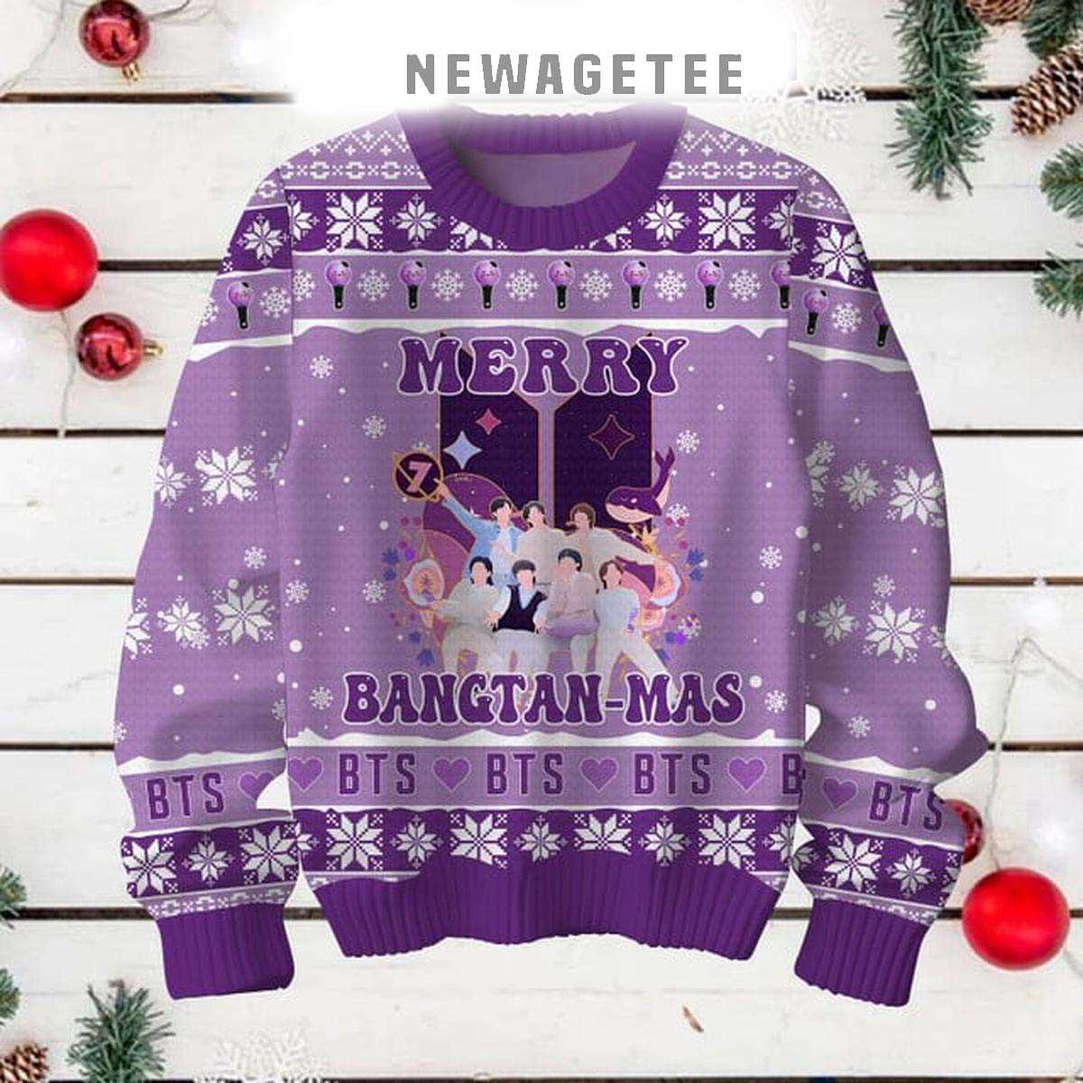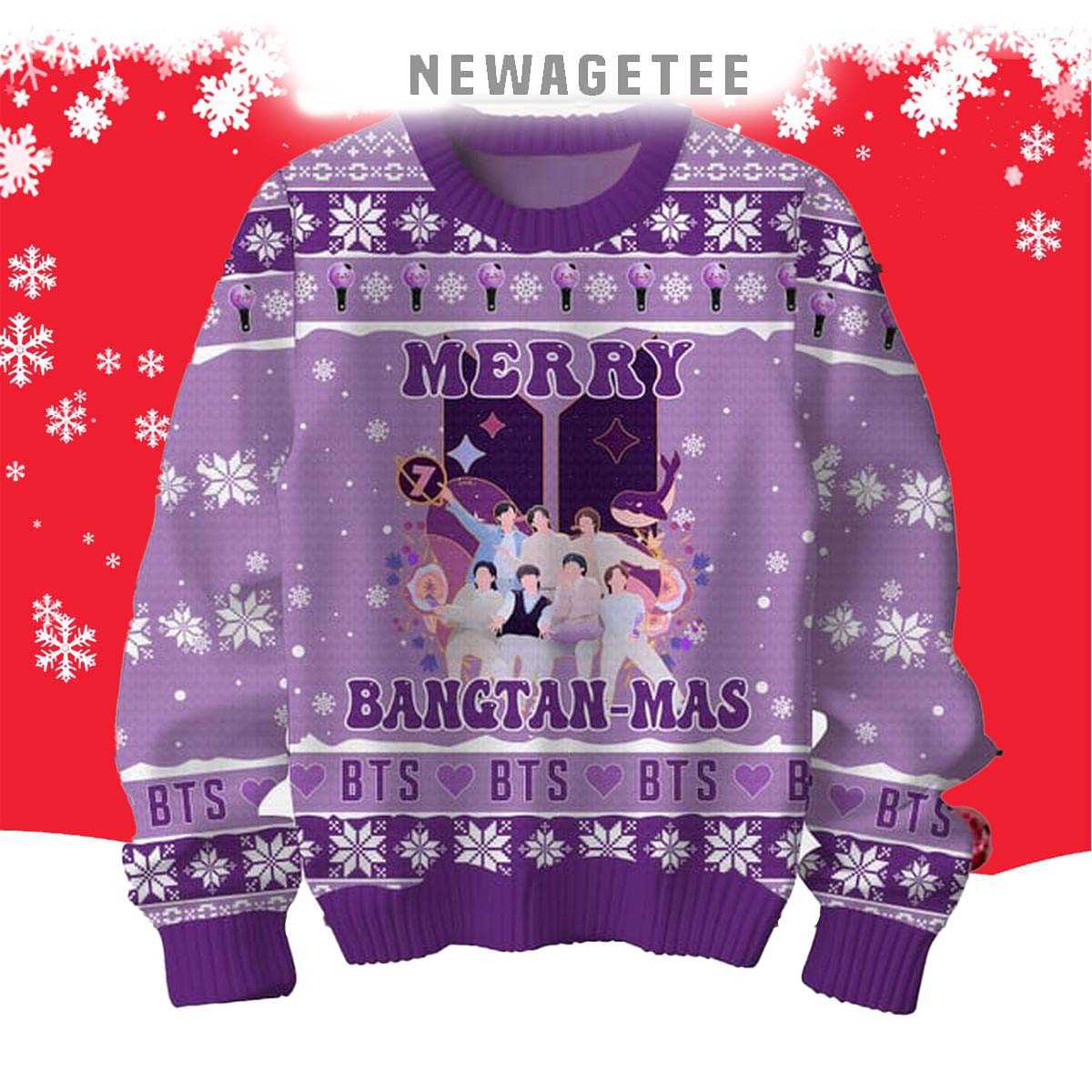 Meticulously crafted from a cozy, high-quality knit, this sweater provides superior warmth and comfort, perfect for fan gatherings, holiday parties, or simply streaming your favorite BTS tracks. The design is an adorable and spirited fusion of BTS’s iconic symbols and classic Christmas elements. Picture the BTS logo adorned with Santa hats, TinyTAN characters celebrating amongst snowflakes, or festive “ARMY” emblems sparkling with holiday lights and ornaments. The central graphic would likely feature a cheerful “Merry Bangtan Mas” message, perhaps surrounded by playful elements that represent each member or their beloved songs. The dominant color scheme would be a delightful mix of traditional reds, greens, and whites, infused with BTS’s signature purples or blues, creating a truly unique and charming “ugly Christmas sweater” aesthetic.