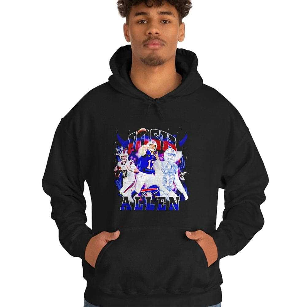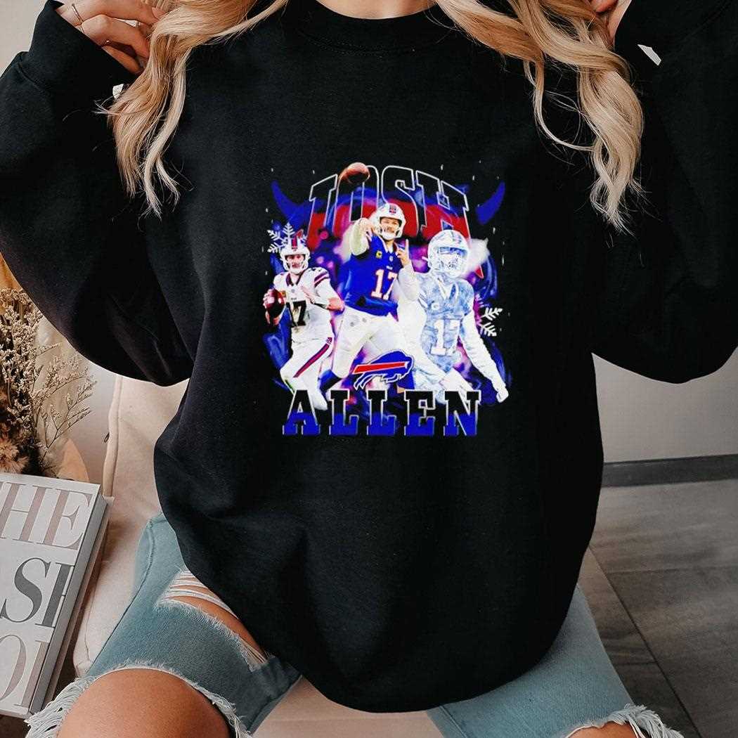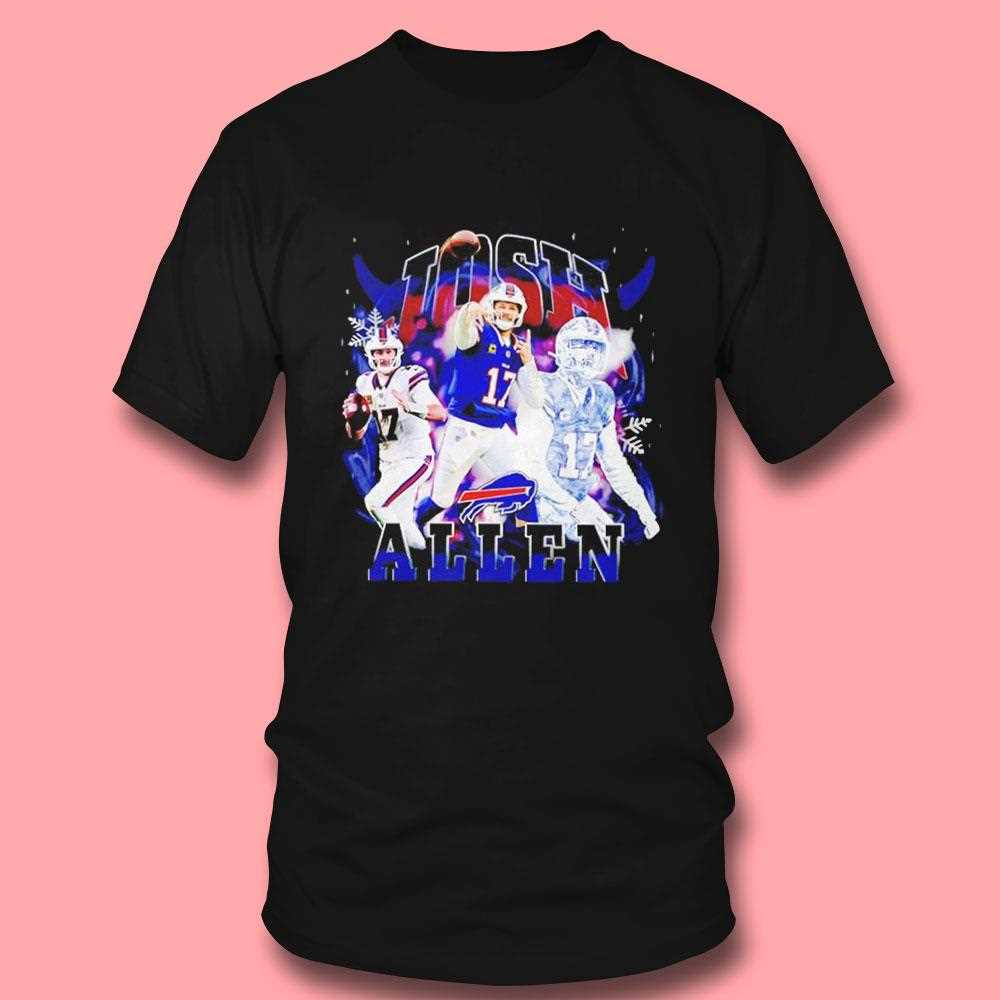 Celebrate the “Notorious” QB1 with this stylized Josh Allen graphic tee. The design blends the intensity of a top-tier NFL quarterback with a streetwear-inspired layout. It features a collage of Allen in his most iconic poses—throwing a laser downfield and hurdling defenders—surrounded by “Bills Blue” accents. The word “NOTORIOUS” is splashed across the chest in a heavy, block-letter font that demands attention, reflecting Allen’s reputation as a fearless competitor who isn’t afraid to take risks. The color grading on the photos gives it a modern, cinematic feel, moving away from traditional sports merch into the realm of high-fashion athletic wear. This tee is for the fan who appreciates Allen’s unique blend of brute strength and precision. Dominate the streets just like Josh dominates the field; buy your Buffalo Bills Josh Allen Notorious Tee right now!. T-shirt !