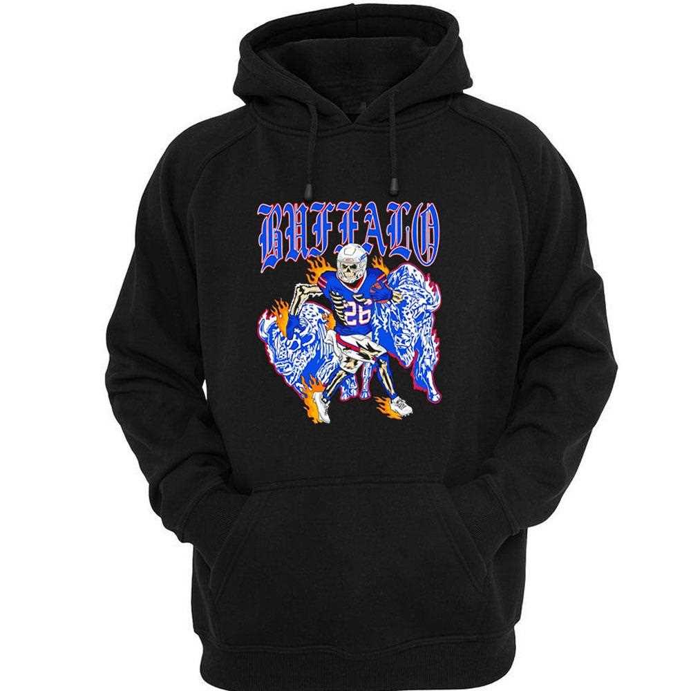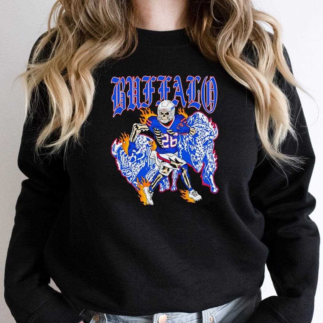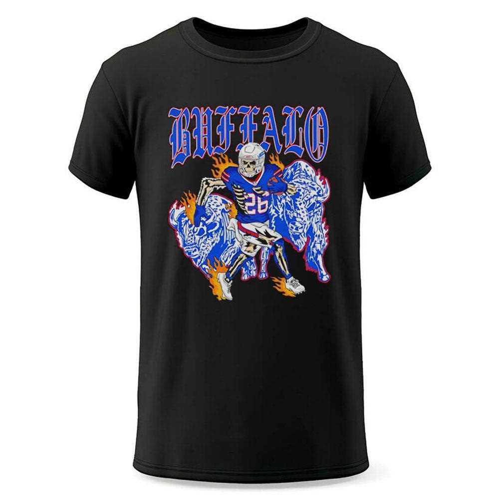 Buffalo Gothic Text Skeleton Football Player 26 Running Between Blue Bison On Fire Tee