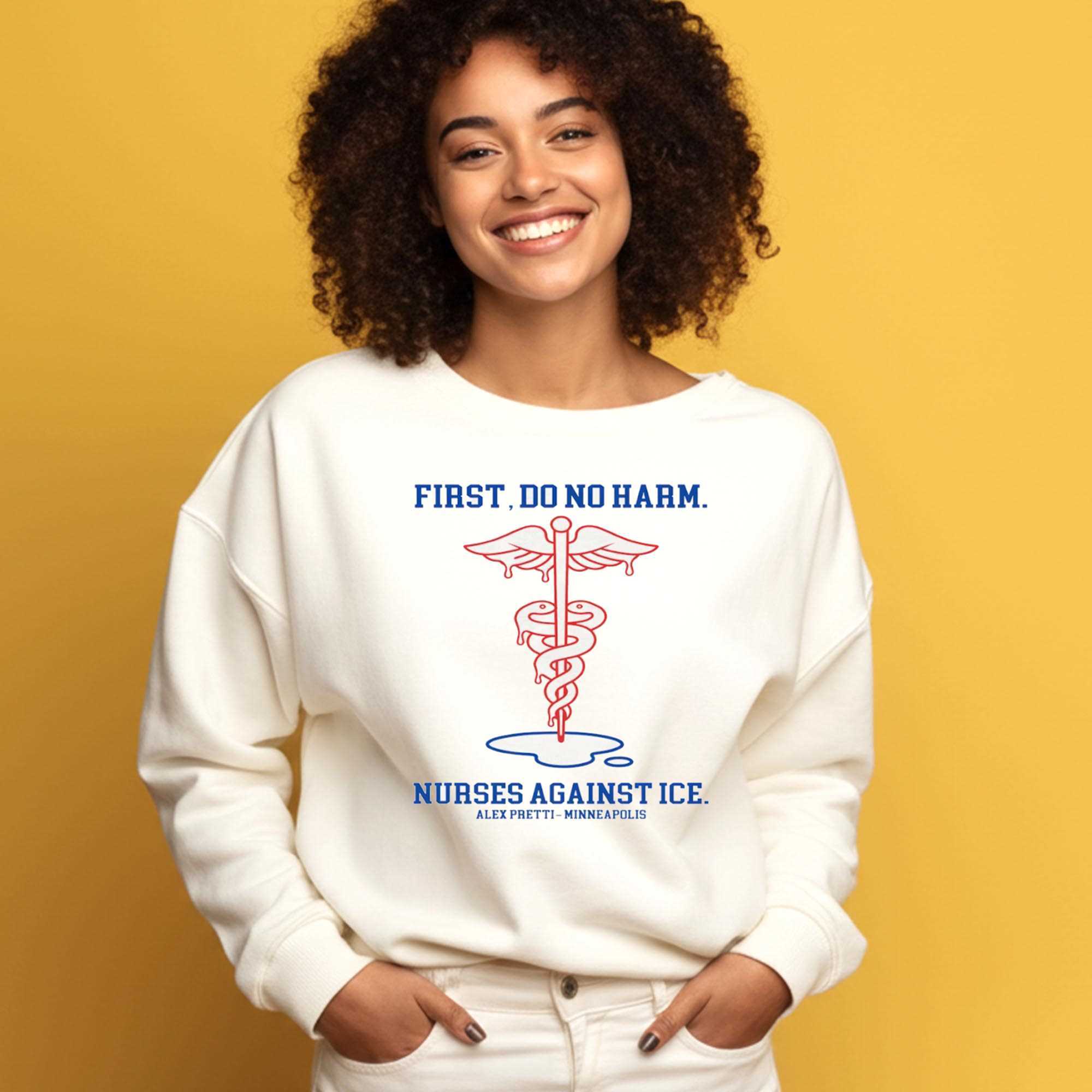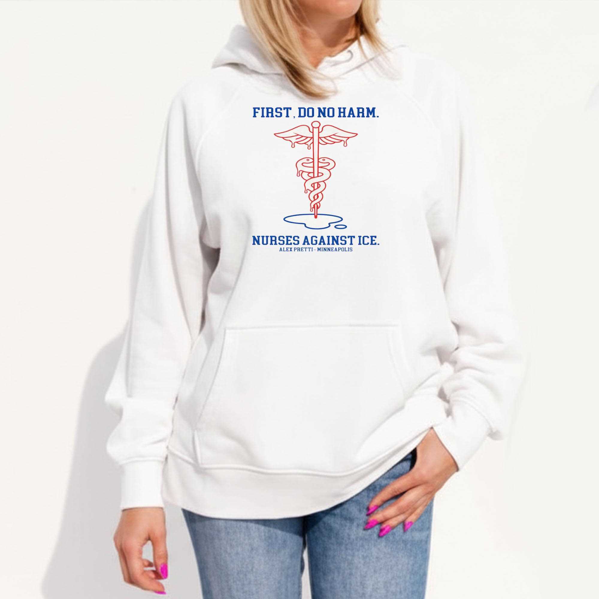 Combine professional pride with powerful social advocacy in the Caduceus First Do No Harm Nurses Against Ice Alex Pretti Minneapolis Tee. This design is a striking piece of visual commentary, featuring a stylized medical Caduceus intertwined with messages of humanitarian support and political resistance. The graphic is rendered in a clean, red and blue palette that evokes the colors of both the healthcare field and the national flag, creating a look that is authoritative and meaningful. It specifically honors the “Nurses Against ICE” movement and the spirit of Minneapolis activism, making it a must-have for frontline workers and social justice advocates alike. The text “First, Do No Harm” serves as a poignant reminder of the ethical foundations of nursing and the drive for a more just society. Set on a crisp white background, the artwork is centered and professional, perfect for community events or daily wear as a conversation starter. Crafted from ultra-soft, breathable cotton, this tee provides all-day comfort for those on their feet or engaged in advocacy work. It represents a commitment to human rights and the protection of the marginalized. Show your solidarity and your dedication to your calling with a design that speaks truth to power. Join the community of conscious caregivers. Secure your stance and buy the Caduceus First Do No Harm Nurses Against Ice Alex Pretti Minneapolis Tee now!. T-shirt !