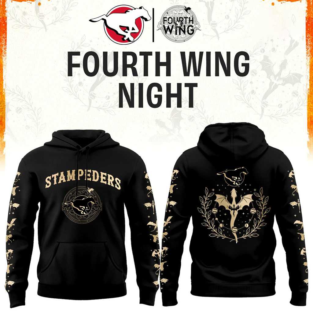 Conquer the field and the skies with the Calgary Stampeders Fourth Wing Night Hoodie, where CFL grit meets legendary fantasy lore. This hoodie features a dark, mysterious black base highlighted by shimmering gold foil graphics that wrap around the sleeves in a dragon-scale pattern. The back is a true masterpiece, showcasing a large golden dragon silhouette merged with the Stampeders’ iconic horse logo, symbolizing a fierce and unstoppable spirit that is ready for battle.The front of the hoodie features a stylized “STAMPEDERS” wordmark in golden ancient-style script, accompanied by the team crest. Made from a heavy-weight, luxury cotton blend, this hoodie is built to withstand the elements while providing a cozy, premium feel. The gold-accented dragon wings on the sleeves add a sense of motion and power to the design, making it one of the most unique pieces of football merchandise ever created. It’s a perfect tribute to the strength and history of Calgary sports.Whether you are a fan of epic storytelling or a dedicated Stampeders supporter, this hoodie offers a bold way to express your passion. It’s designed for those who want to stand out from the crowd and wear something that tells a legendary story. It combines the prestige of the CFL with the magical allure of dragon riders.Answer the call to adventure and represent the Red and White with golden fire! Buy your Calgary Stampeders Fourth Wing Night Hoodie now and ride toward victory!