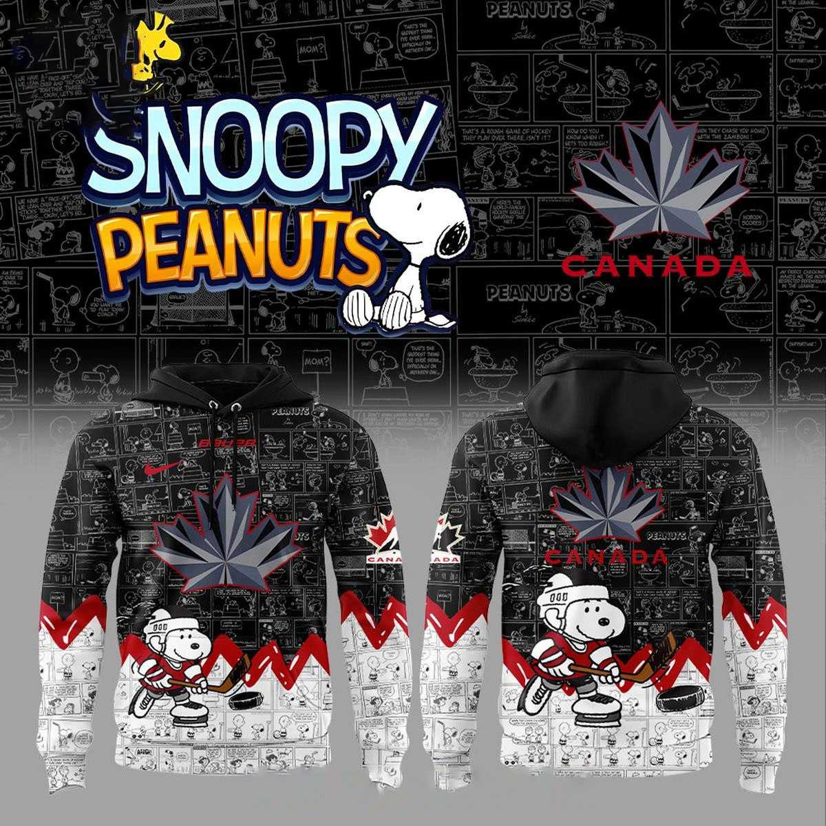 Get ready to hit the ice in style with the **Canada Hockey Team Snoopy Peanuts Night 2026 National Pride Tee Hoodie**! This unique design masterfully blends the beloved world of Peanuts with fervent Canadian hockey spirit. Featuring a dynamic black and white comic strip backdrop, the main body showcases a striking geometric grey maple leaf with “CANADA” in bold red. Below a vibrant red and white zig-zag pattern, our favorite beagle, Snoopy, skates into action, fully geared in a red and white hockey jersey, stick in paw, ready to score. It’s a witty nod to Canadian passion for hockey, capturing Snoopy’s playful enthusiasm amidst classic comic panels, creating a truly charming and spirited tribute to national pride and timeless cartoon fun.