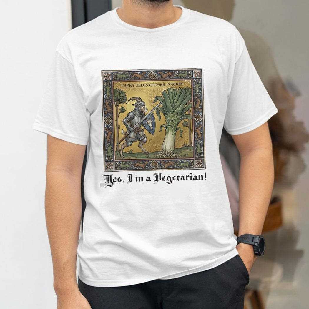 Infuse your wardrobe with a touch of classical wit and quirky artistry with this unique “Capra Miles” design. The shirt features an intricate, woodblock-style illustration of a goat (capra) dressed in military attire, engaged in a whimsical battle against a giant leek (porrum). Beneath this artistic scene, the text “Yes, I’m a vegetarian!” provides a humorous punchline in a sophisticated serif font. The earthy tones of green, brown, and ochre create a vintage, academic aesthetic that appeals to fans of history, botany, and clever wordplay. This tee is printed on a soft-wash, mid-weight cream cotton base, offering a “lived-in” comfort from the very first wear. The detailed linework of the armor and the textures of the vegetable are rendered with museum-quality precision. It’s a perfect piece for those who want to express their lifestyle choices with a sense of humor and a refined artistic flair. Whether you’re visiting a farmer’s market or a local library, this shirt is guaranteed to spark curiosity and conversation. It represents a sophisticated departure from standard graphic tees. Embrace your unique style and your diet with a smile—buy the Capra Miles Contra Porrum Yes Im A Vegetarian Tee right now!. T-shirt !