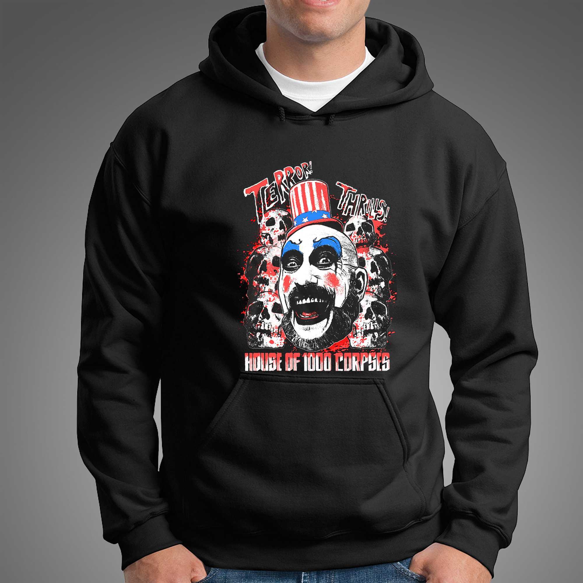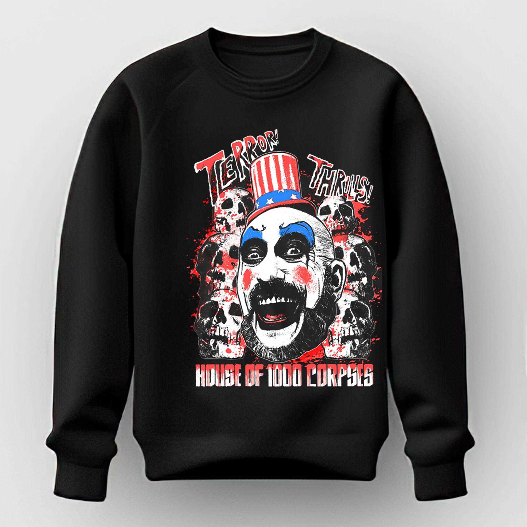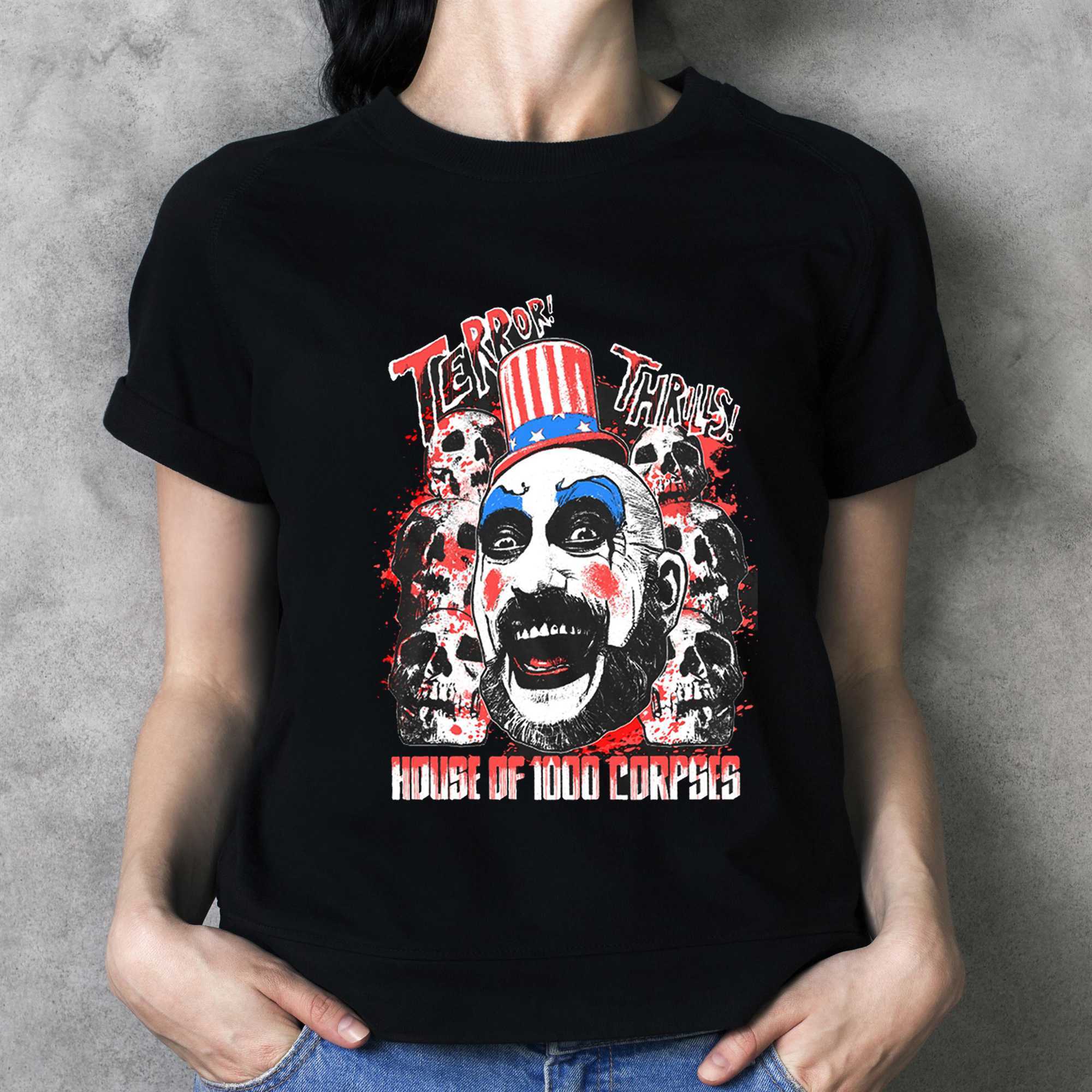 Step into the chaotic and terrifying world of Rob Zombie’s cult horror masterpiece with the Captain Spaulding Terror Thrills House Of 1000 Corpses Tee. This design is a high-octane tribute to the most charismatic and disturbing clown in cinema history, featuring a stunning, airbrush-style portrait of Spaulding in his iconic Uncle Sam hat. The artwork captures the grit, the greasepaint, and the sinister energy of the Firefly family, utilize a vibrant red, blue, and black palette that mirrors a classic grindhouse film poster.The bold “TERROR THRILLS” typography frames the image with a sense of dangerous fun, making it an absolute must-have for horror aficionados and fans of alternative cinema alike. Set on a premium black cotton tee, the high-contrast graphic pops with professional intensity that demands attention. The shirt is crafted from ultra-soft, 100% ringspun cotton, providing a luxurious feel and a breathable fit that is perfect for film festivals, conventions, or just making a bold statement in your daily life. It pays tribute to the legendary Sid Haig and the role that changed the landscape of modern horror.Show your respect for the master of the macabre and the legends of the screen. Don’t be a “clown”—stand out with a look that is truly legendary and slightly twisted. Secure your place at the gas station of style and buy the Captain Spaulding Terror Thrills House Of 1000 Corpses Tee right now to showcase your horror credentials!. T-shirt !