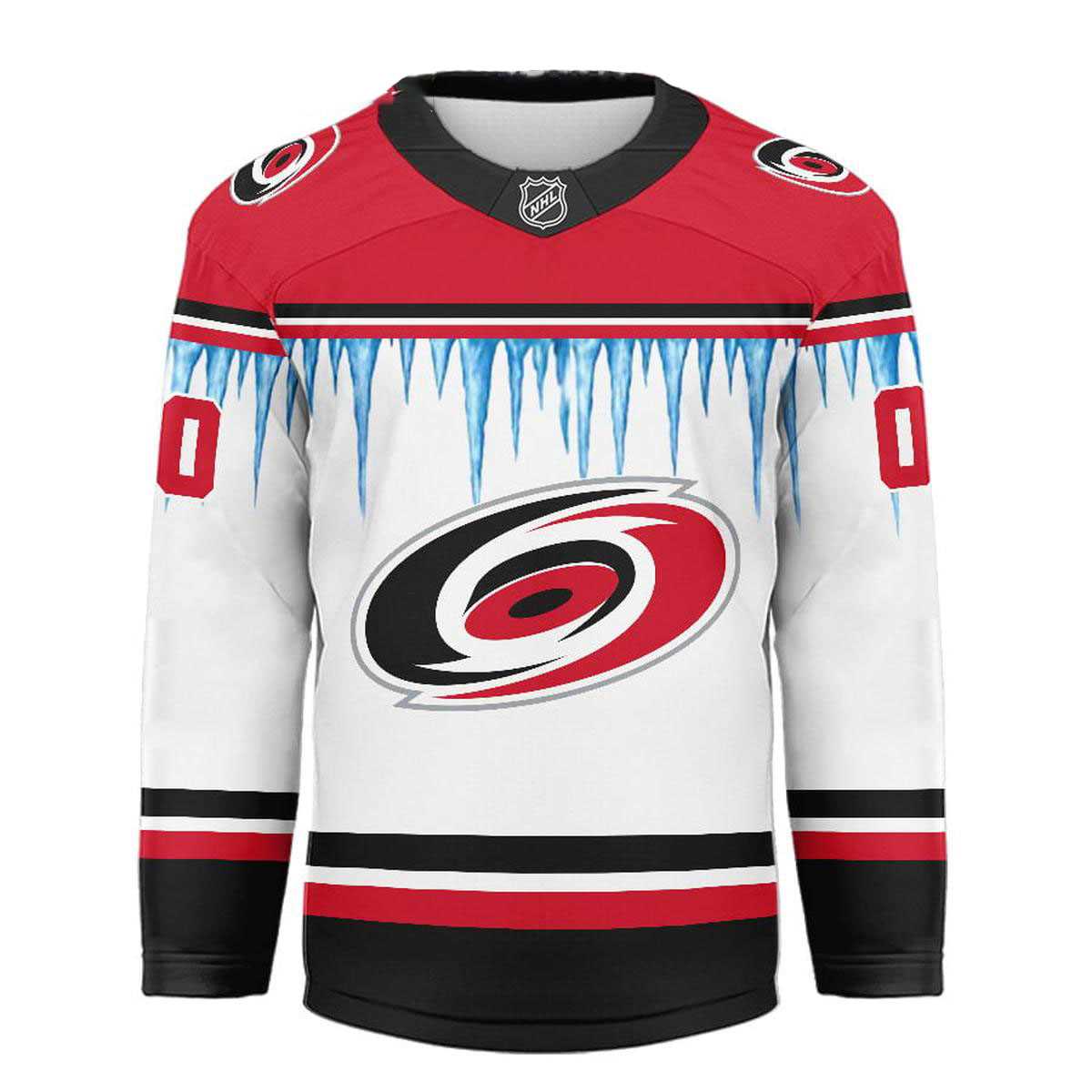 Prepare for a holiday season that hits as hard as a Category 5 storm with the Carolina Hurricanes Icicle Christmas Tree Custom Hockey Jersey. This unique design captures the chaotic energy of the Canes and fuses it with the serene beauty of a winter wonderland. The jersey features a crisp white body that serves as a canvas for the Hurricanes’ intense red and black color palette. The shoulder yoke is dipped in the team’s signature red, mimicking the warning flags of a coming storm, but with a seasonal twist: a row of jagged, realistic blue-tinted icicles hanging down the chest, symbolizing a freeze over PNC Arena.
