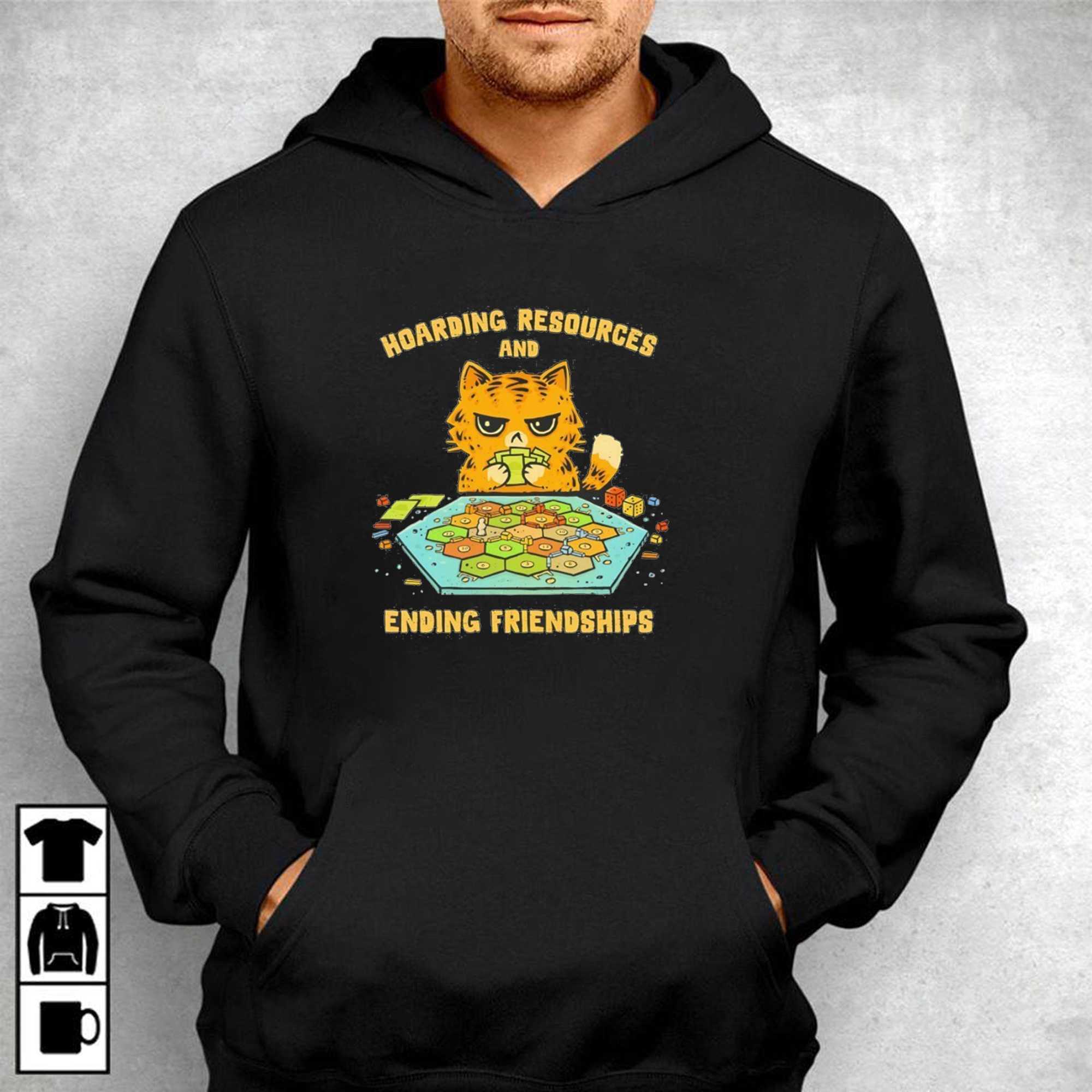 Unleash your inner board game strategist with the “Cat Hoarding Resources And Ending Friendships Tee”! This hilariously relatable design features a fiercely grumpy, vibrant orange tabby cat intently clutching a stack of green cards, clearly refusing to trade. Perched behind a detailed hexagonal board game reminiscent of Settlers of Catan, complete with colorful resource tiles in shades of green, orange, and brown, settlements, roads, and number tokens, the cat embodies the competitive spirit. Above, “HOARDING RESOURCES AND” arcs in a bold, distressed yellow-orange font, mirroring “ENDING FRIENDSHIPS” below the game board, perfectly capturing the intense, sometimes friendship-testing, fun of strategic gaming. It’s a purr-fectly witty nod to anyone who takes their game nights seriously.