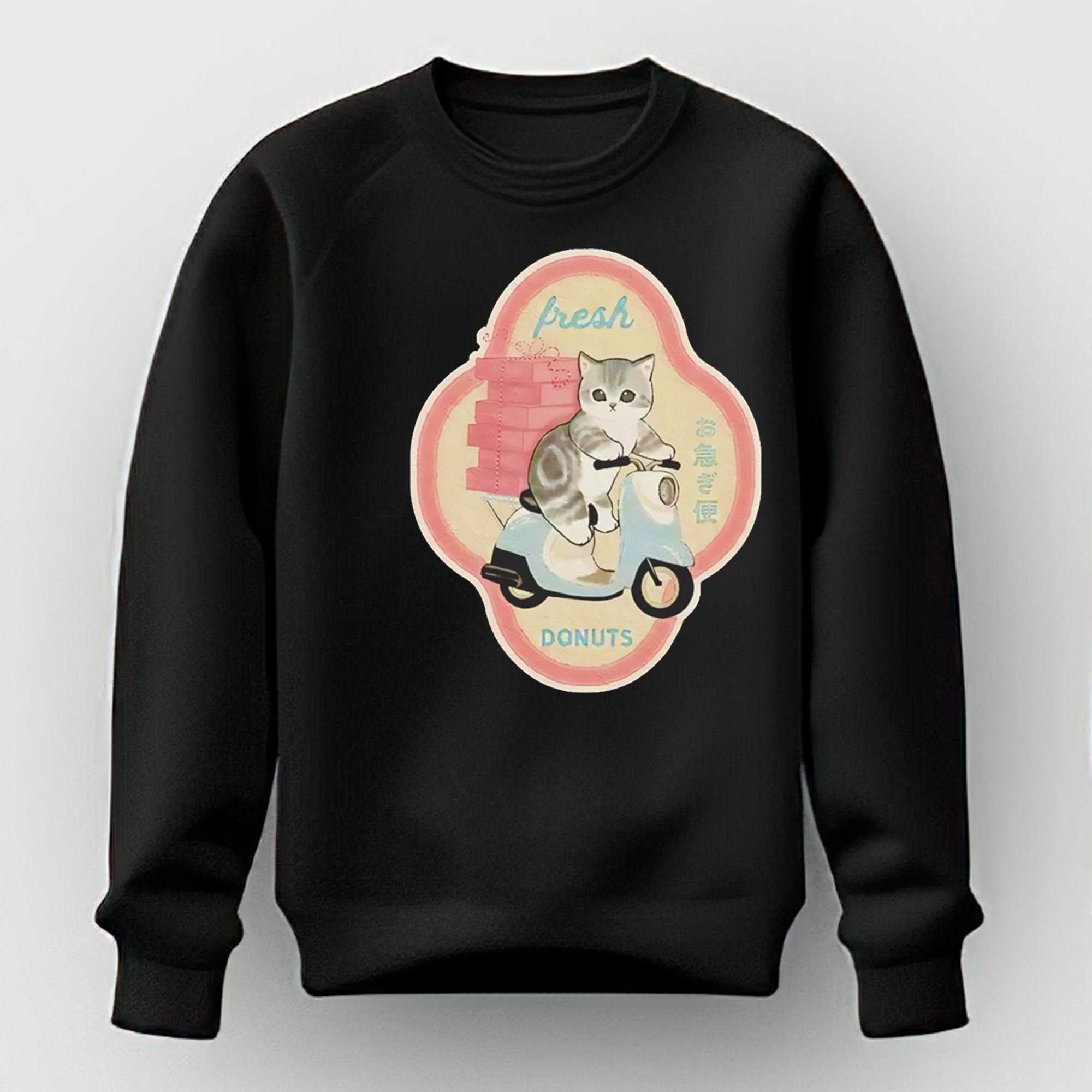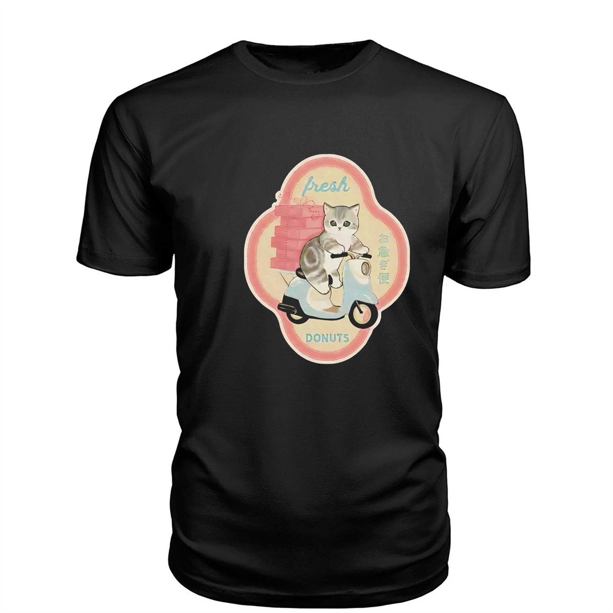 Bring a dash of feline fun to your daily look with the incredibly charming Cat Mofusand Fresh Donuts Delivery tee. This design showcases the beloved Mofusand kitten decked out in a delivery driver uniform, expertly balanced on a vintage-style scooter with a stack of donut boxes. It’s a playful and creative take on urban life, blending the hustle of the city with the sheer cuteness of the Mofusand brand. The vibrant colors of the donuts—pinks, yellows, and browns—pop vividly against the deep black background, creating a high-impact visual that is guaranteed to spark smiles. Crafted from ultra-soft ringspun cotton, this shirt offers a luxurious feel and a breathable fit that keeps you cool under pressure. The print utilizes high-definition DTG technology to ensure the intricate details of the kitten’s face and the donut shop branding remain sharp and vivid over time. It’s a versatile staple that pairs perfectly with your favorite denim or a casual skirt. This shirt is for the trend-setters who value original art and isn’t afraid to show their playful side. Celebrate your love for pets and pastries in one stylish package. Whether you’re out running errands or meeting friends for brunch, this tee identifies you as someone with a great sense of humor and impeccable taste. Grab this limited-edition look before it’s gone. Buy the Cat Mofusand Fresh Donuts Delivery today and deliver some style!.