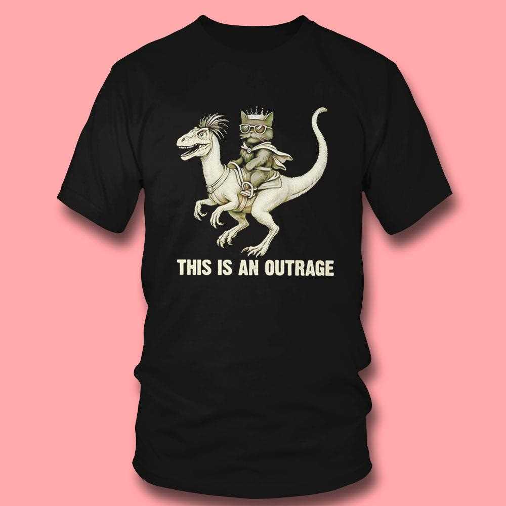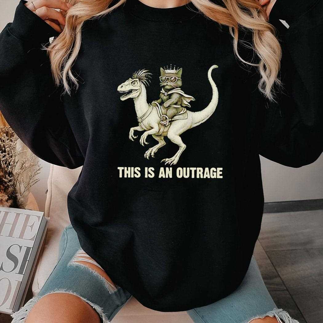 Are you tired of boring, conventional fashion? Step into a world of pure, unadulterated absurdity with this graphic masterpiece. This isn’t just a t-shirt; it is a narrative of epic proportions featuring a feline overlord taking command of a Jurassic beast. The design centers around a hilariously dramatic cat, perched atop a roaring dinosaur, screaming its dissatisfaction to the heavens. The vintage, distressed art style gives it a classic B-movie poster vibe, while the bold caption “THIS IS AN OUTRAGE” perfectly captures the feeling of every cat owner who has ever been five minutes late with dinner.