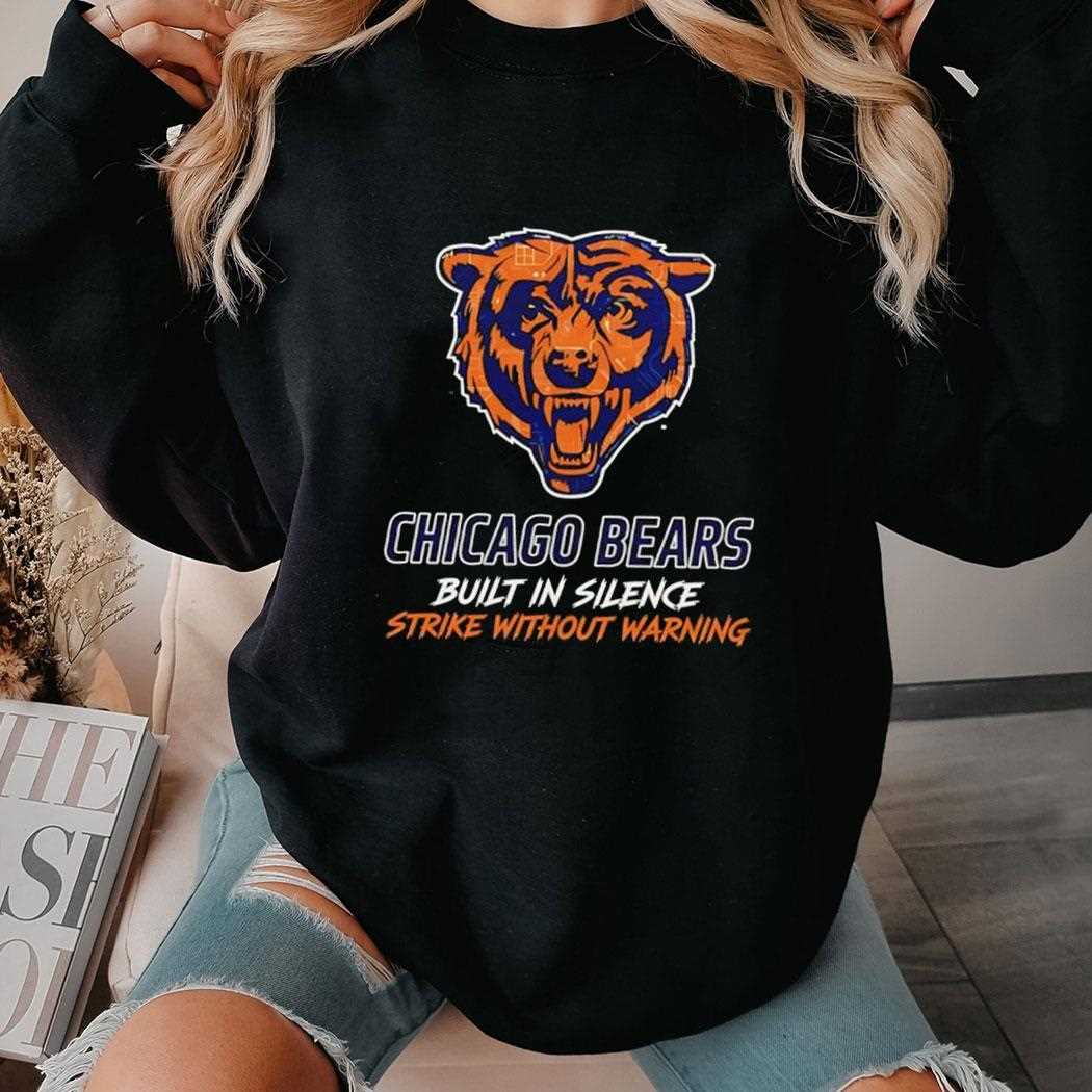 Honor the legendary “Monsters of the Midway” with a design that speaks to the toughness of Chicago football. The Chicago Bears Built In Silence Strike Without Warning Tee features a roaring bear head logo in classic orange and navy blue, framed by a rugged, industrial-style font. The motto emphasizes the team’s historic focus on a dominant defense and hard-hitting playstyle. The distressed textures within the graphic give it a vintage, battle-worn feel that resonates with the heritage of Soldier Field. This shirt is built for the fan who knows that true strength is forged in the cold and the quiet of the off-season. The premium fabric provides warmth and durability, making it an ideal choice for late-season tailgates. Show your grit and your loyalty—purchase the Chicago Bears Built In Silence Strike Without Warning Tee now!. T-shirt !