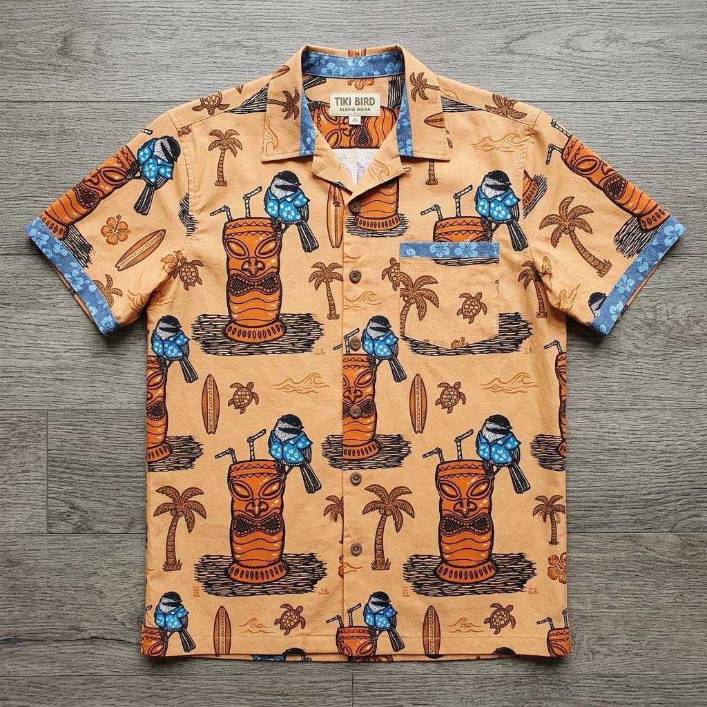 Experience unparalleled comfort and style with this premium quality shirt, crafted from a breathable, lightweight woven fabric that ensures you stay cool and comfortable even on the warmest days. Its signature button-down tropical style offers a relaxed, airy fit, designed to flow effortlessly with your movements, making it perfect for ultimate leisure. Our advanced high-definition all-over printing technology guarantees vibrant, fade-resistant colors that capture every intricate detail of this paradise-inspired pattern, ensuring the whimsical chickadees and charming tiki mugs remain as vivid as your vacation memories.
