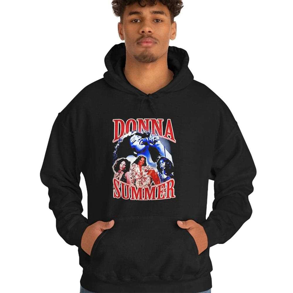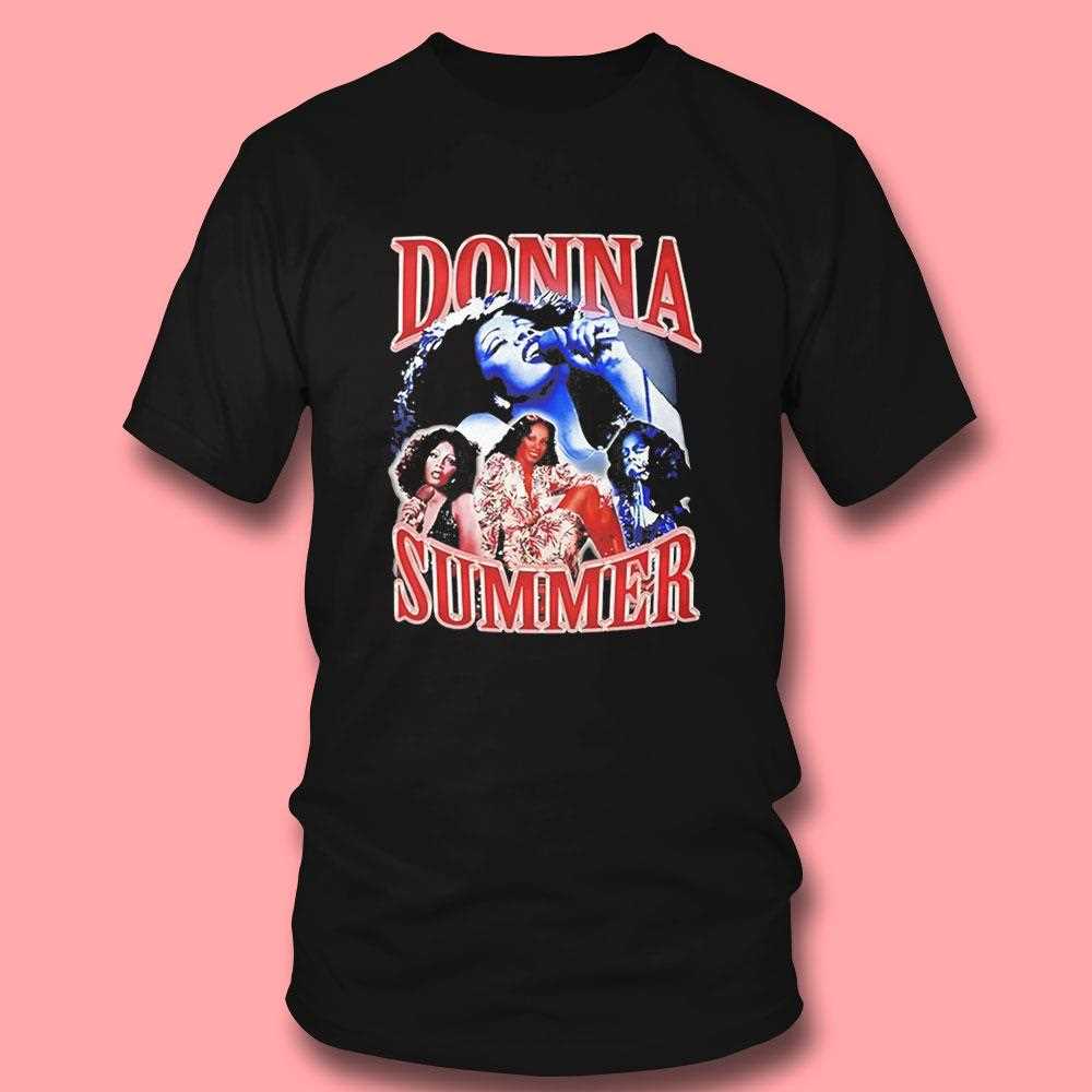 Highlighted with bold, red typography reminiscent of classic album covers, the name “DONNA SUMMER” stands out, commanding attention. The layout of the images creates a dynamic movement, celebrating the energy of disco and soul music. Whether you are a die-hard fan of her timeless hits or a fashion-forward individual looking for that perfect oversized graphic tee to pair with jeans, this piece delivers on all fronts. It’s a wearable piece of music history that celebrates the legacy of one of the greatest voices of all time, possibly mashed up with modern sports culture references for a unique twist.