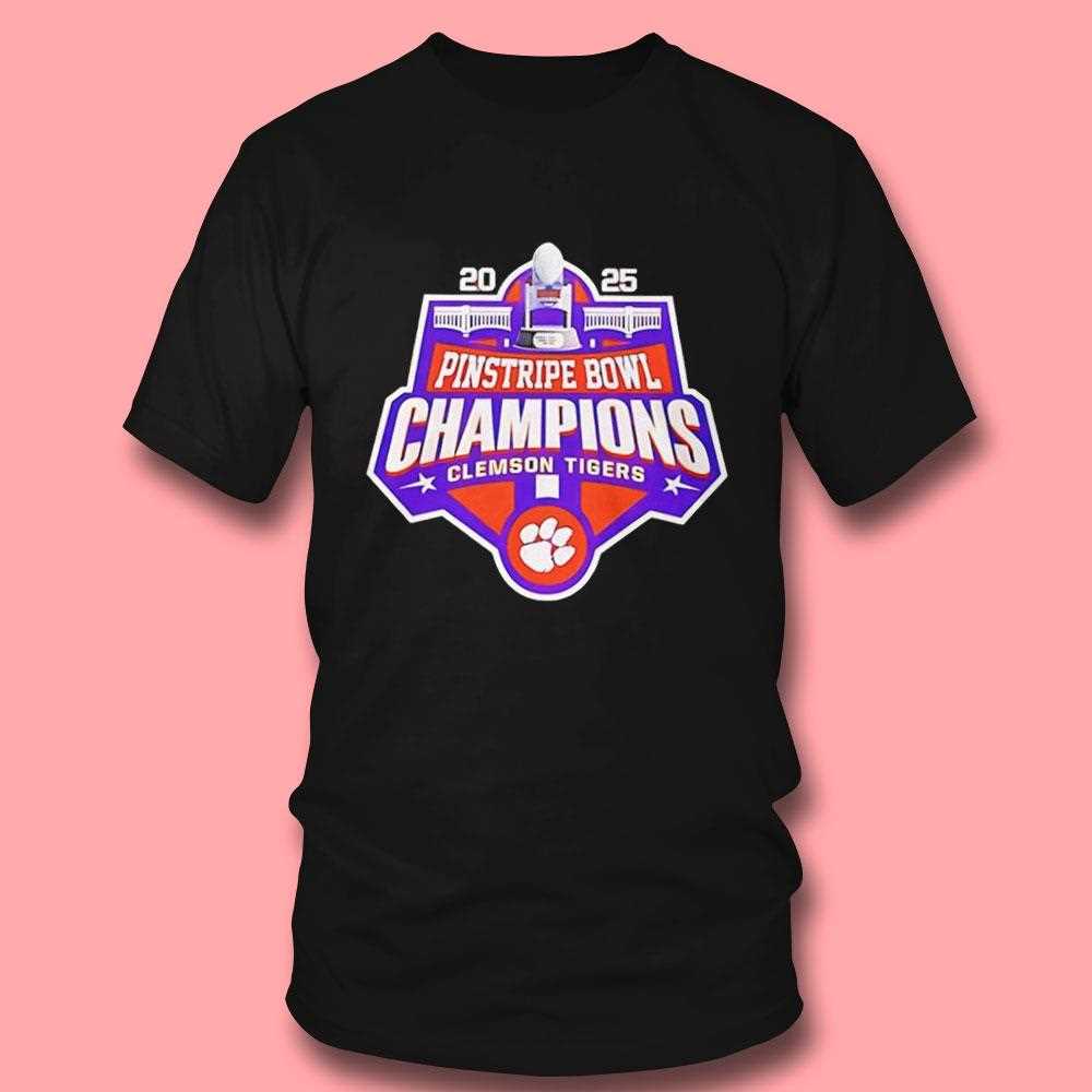Celebrate a victorious end to the 2025 season with this official Clemson Tigers Pinstripe Bowl Champions tee. The design features a large, celebratory graphic of the bowl trophy flanked by the Clemson Tiger paw and the Pinstripe Bowl logo. Vibrant “Clemson Orange” and “Regalia Purple” dominate the design, with “CHAMPIONS” written in a massive, bold font across the center. Small details, like the date of the game and the final score (implied), make this a perfect keepsake for students, alumni, and fans. The fabric is soft and durable, ensuring you can wear your victory pride for years to come. It’s a literal badge of honor for the Tiger faithful who followed the team to New York and back. Commemorate the win in style—order your Clemson Tigers 2025 Pinstripe Bowl Champions Tee right now!. T-shirt !