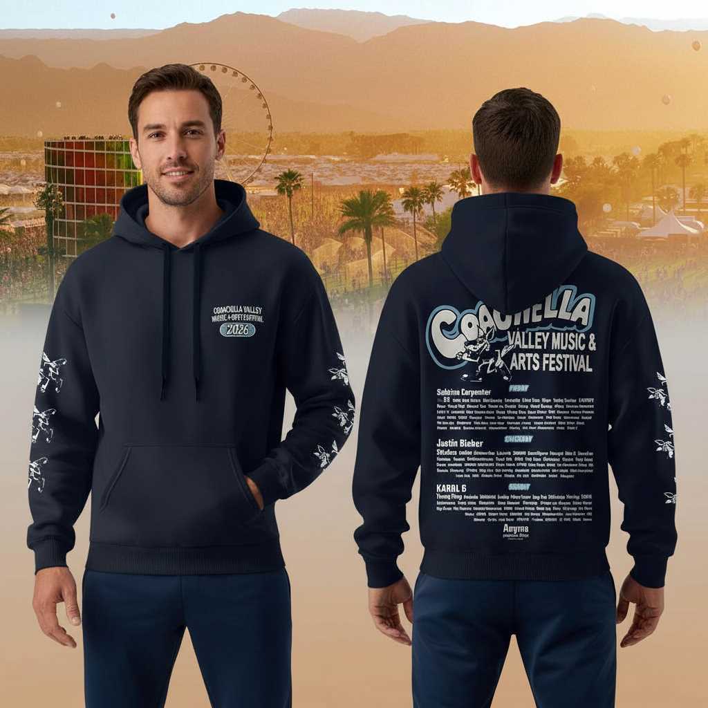 Get ready to satirize the future of music festivals with the Coachella Valley Music and Arts Festival 2026 Lineup Black Hoodie! This ingenious design pokes fun at anticipated festival announcements, featuring a distinctly minimal and humorously underwhelming “lineup” on the back in cool light blue and white. The iconic “Coachella Valley Music & Arts Festival” logo is playfully integrated with a cartoonish insect character—a fly or mosquito—buzzing within the ‘C’. Below, the joke unfolds with headliners like “Sabrina Carpenter” for Friday, “Justin Bieber” for Saturday, and “KAROL G” for Sunday, surrounded by tiny, illegible text hinting at a comically sparse future bill. The sleeves are adorned with repeated white outlines of this winged insect, while the front keeps it clean with a minimalist circular “COACHELLA VALLEY MUSIC & ARTS FESTIVAL 2026” emblem, making it a witty statement for those who appreciate festival humor.