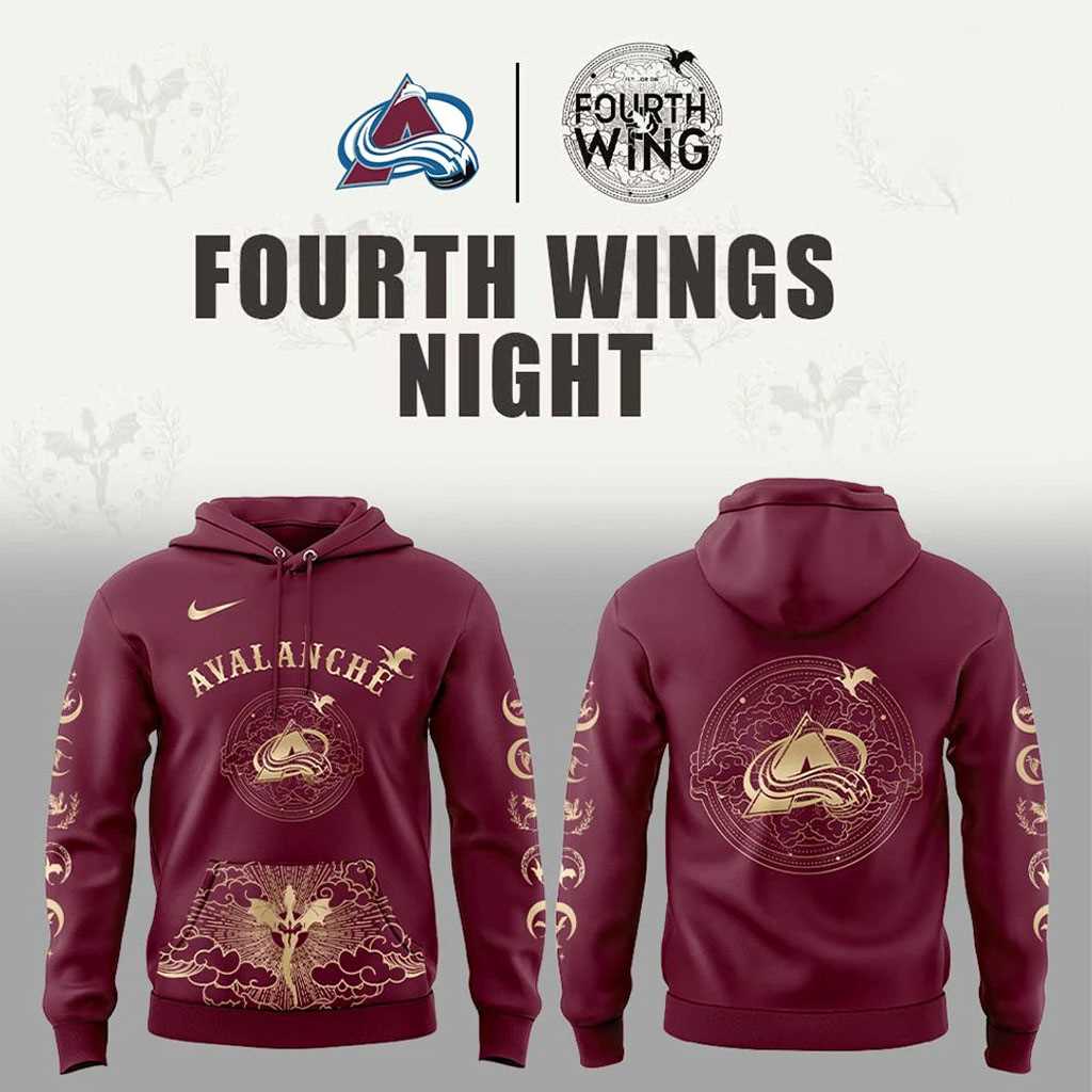 Unleash the fury of the peaks and the magic of the skies with the Colorado Avalanche Fourth Wings Night 2026 Hoodie. This design is a stunning and atmospheric tribute to the “Burgundy and Blue” heritage, reimagined through the lens of dragon-rider lore. The hoodie features a deep, majestic burgundy canvas adorned with shimmering gold-etched wings that spread across the torso and sleeves. Centered on the chest is the iconic Avalanche logo, framed by a prestigious “Fourth Wing” crest that signifies your membership in an elite circle of supporters and fantasy aficionados. It perfectly captures the energy and the high expectations of the Mile High city.