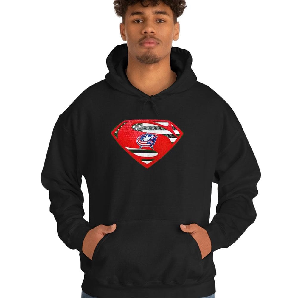 .The Columbus Blue Jackets Superman USA Flag Inside shirt for ladies is a unique and patriotic addition to any fan’s wardrobe. Show your support for the team with this eye-catching design that combines the iconic Superman logo with the American flag.