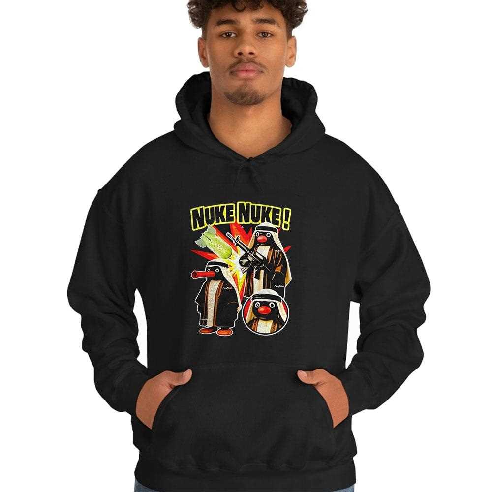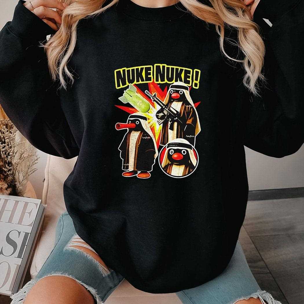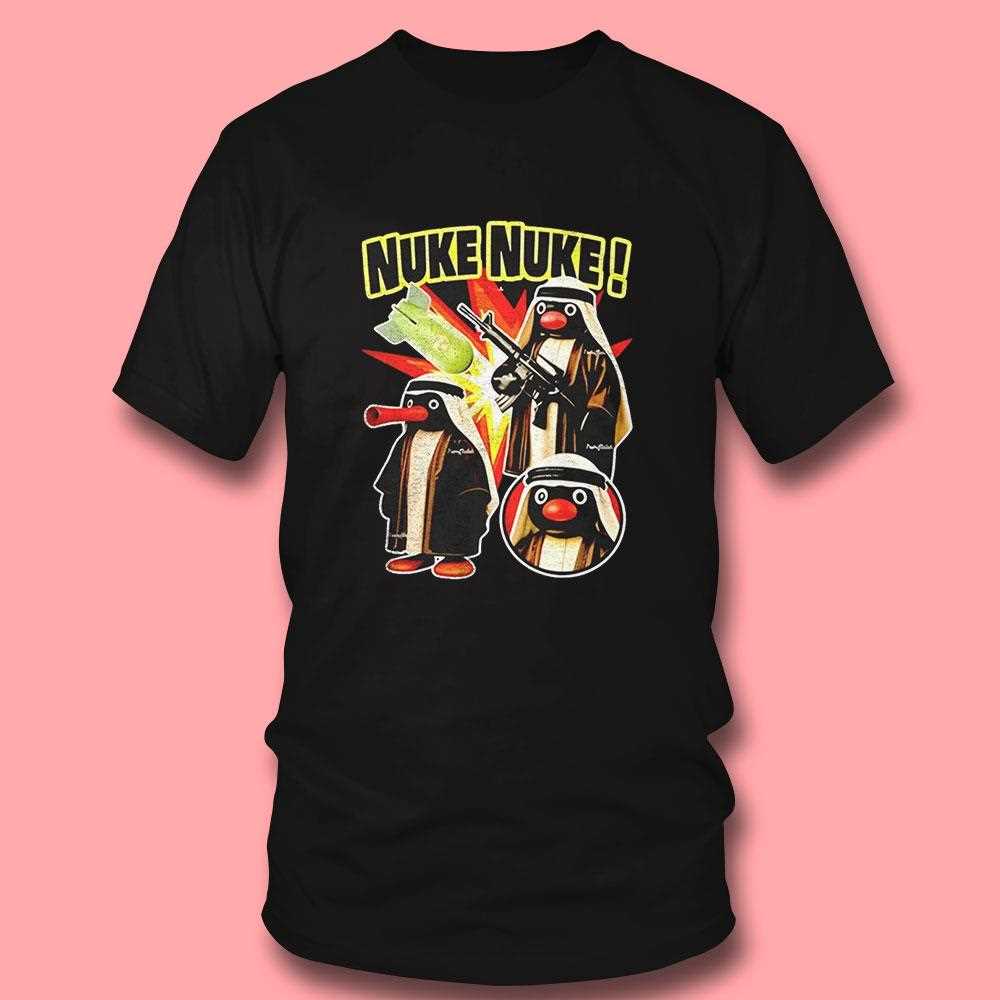 From the Antarctic comes a new revolutionary hero! This absolutely brilliant and absurd t-shirt reimagines the beloved children’s character Pingu as an armed comrade, complete with the rallying cry, “Nuke Nuke!” It’s a hilarious piece of surreal meme culture at its finest. Noot Noot becomes Nuke Nuke! This is the ultimate inside joke for meme lords and connoisseurs of internet chaos. Join the revolution and get this incredible shirt today!.