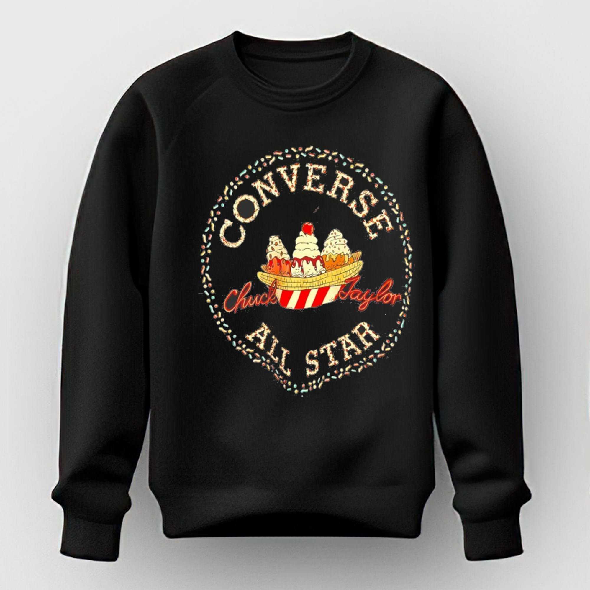 Indulge your sweet tooth and iconic style with the Concerse All Star Chuck Taylor T-Shirt! This design playfully reimagines the classic Converse logo as an irresistible dessert fantasy. The words “CONVERSE” and “ALL STAR” are artfully crafted from golden cookie letters adorned with colorful sprinkles, encircling a vibrant central image. Nestled within is a scrumptious banana split, featuring a yellow boat with red stripes, overflowing with three scoops of creamy ice cream topped with whipped cream, a bright red cherry, with generous drizzles of red and caramel sauces. Below this treat, the “Chuck Taylor” signature is beautifully rendered in a flowing red script. Charming scattered sprinkles border the entire emblem, transforming a footwear icon into a deliciously whimsical statement for lovers of classic kicks and desserts.